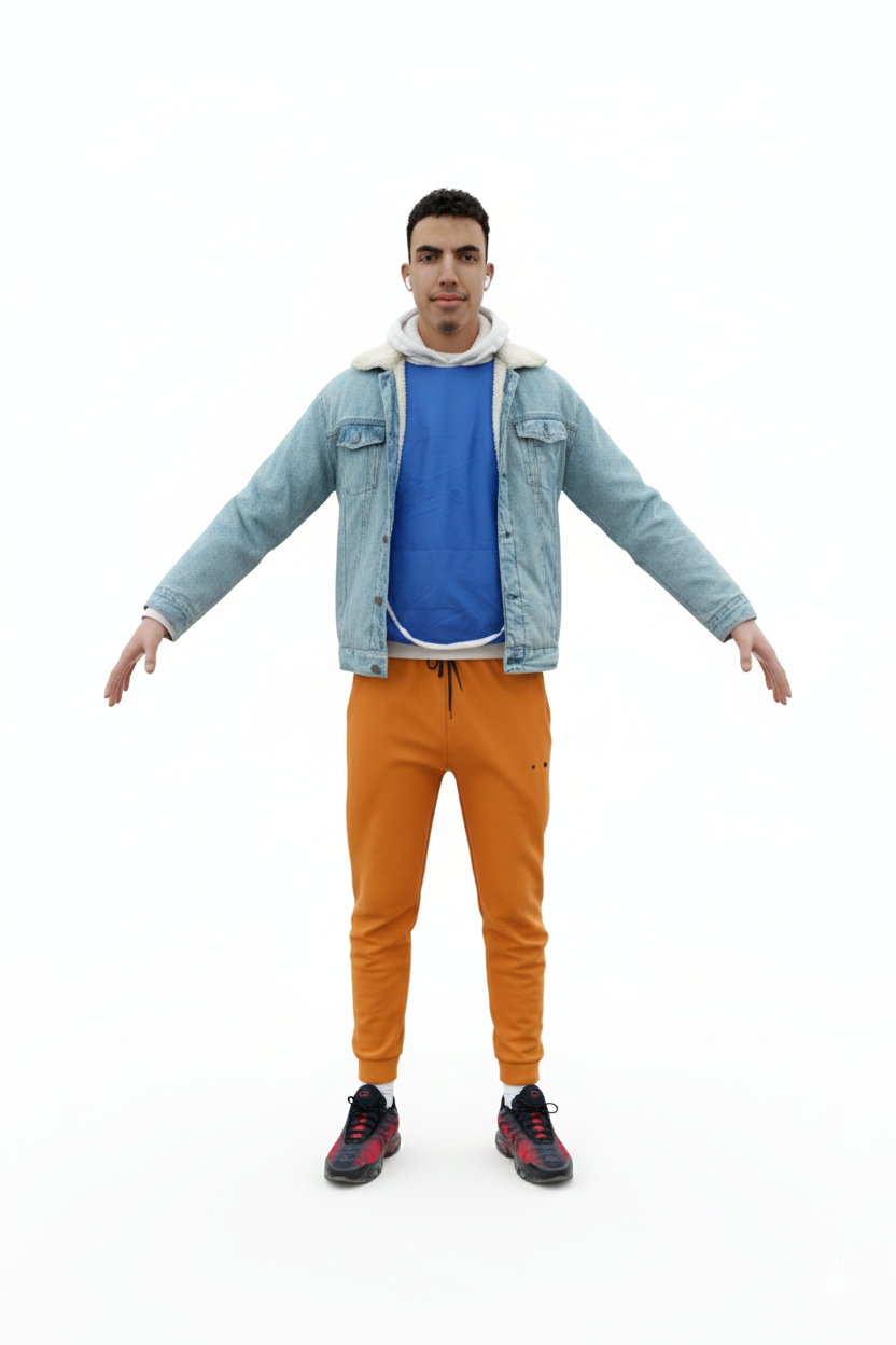 Person standing with arms slightly outstretched. complex geometry, smooth edges, character.