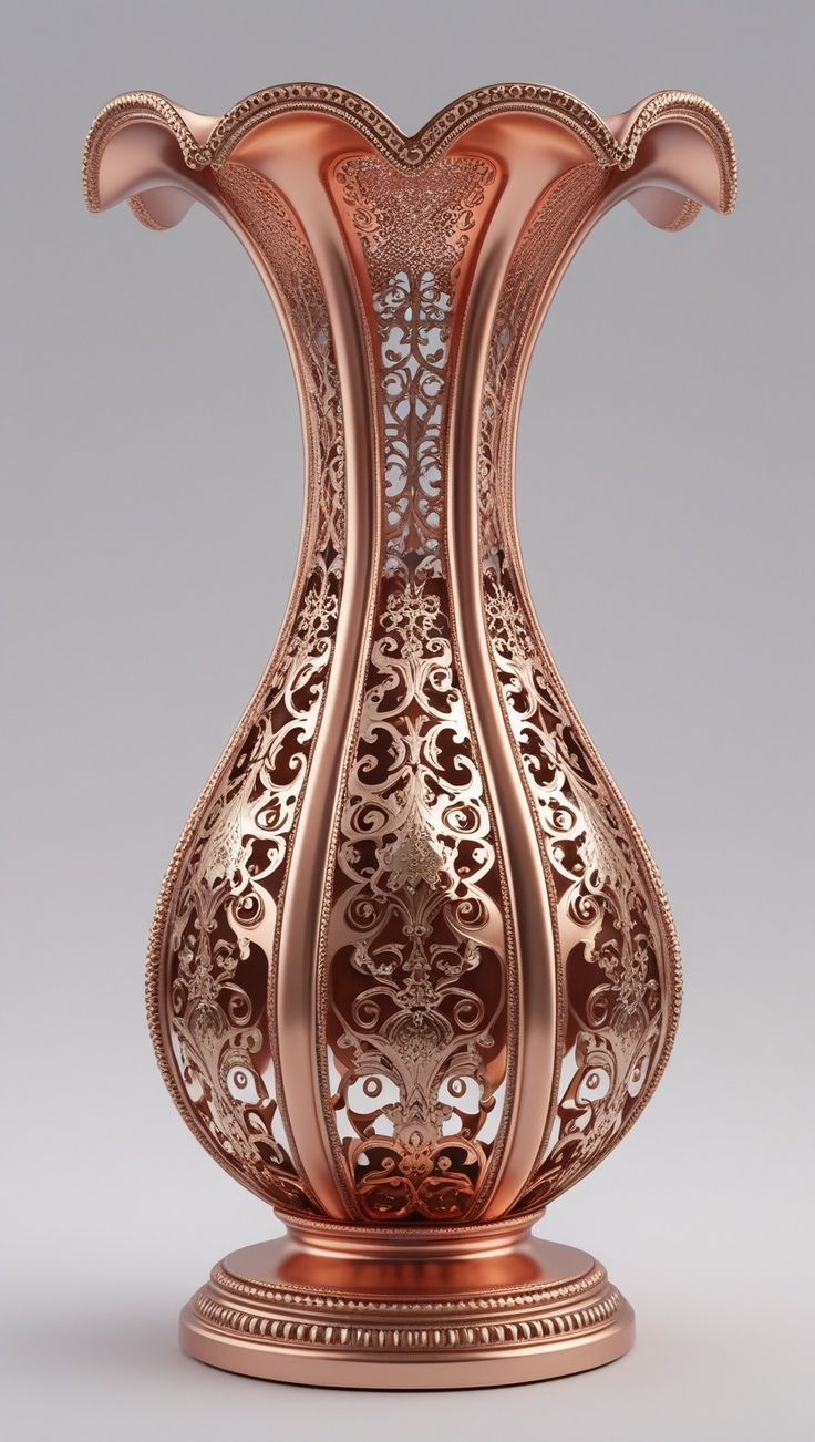 Ornate metallic vase with intricate patterns. sharp edges, complex geometry, symmetric geometry.