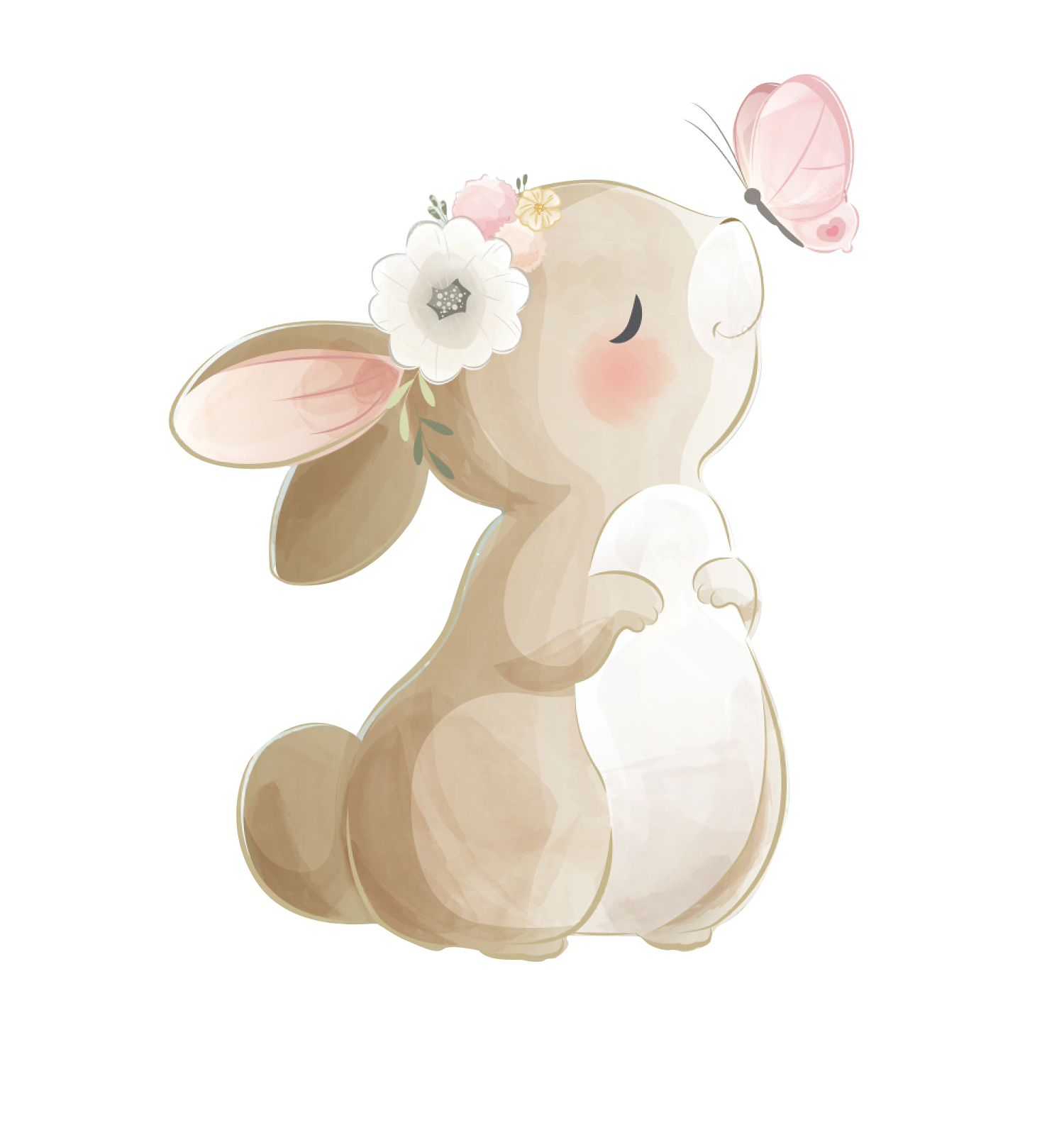 Cute bunny with flower crown and butterfly. smooth edges, simple geometry, character.