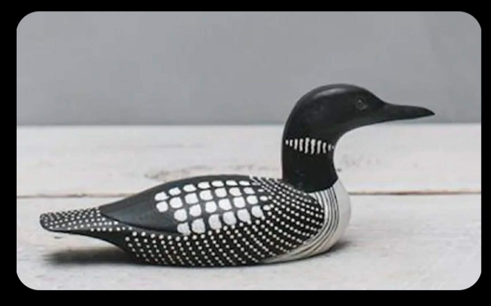 Wooden duck decoy with black and white patterns. smooth edges, simple geometry, game-ready, symmetric geometry.