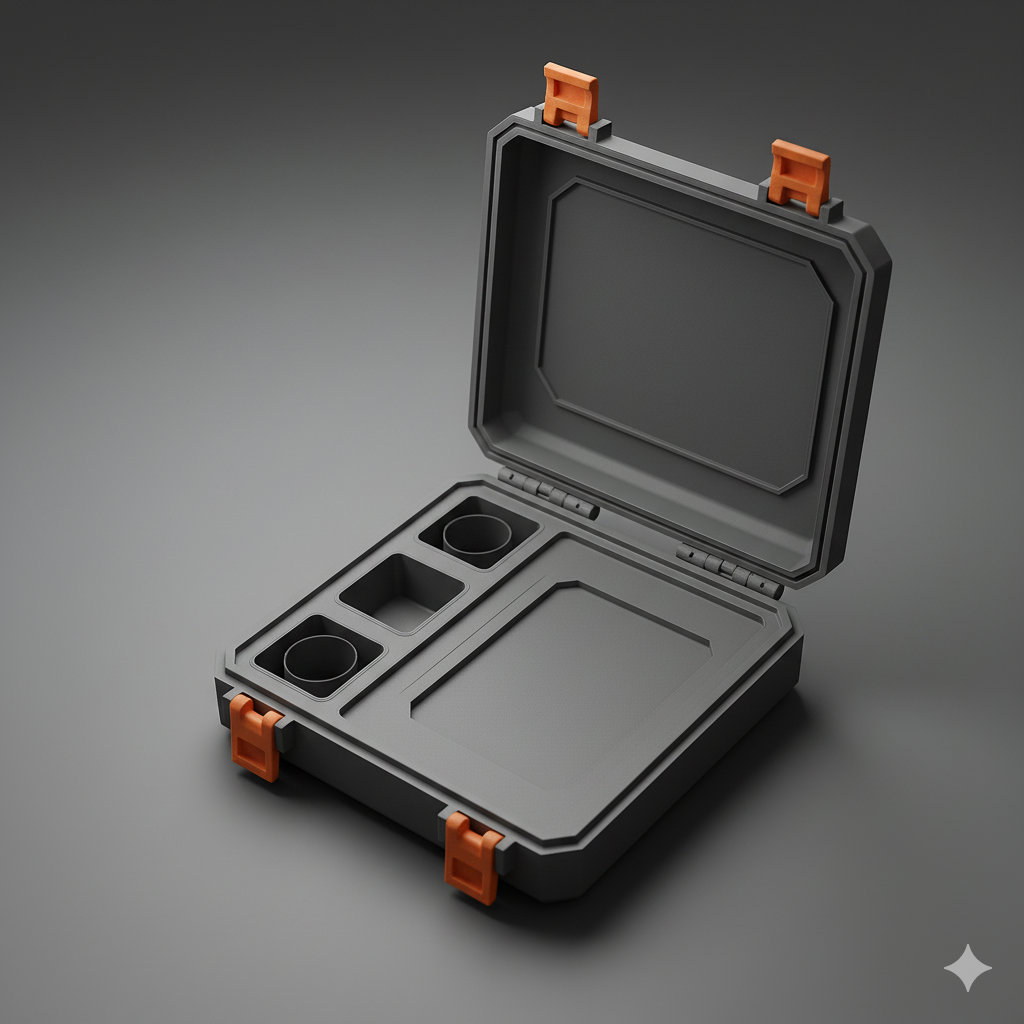 Open hard plastic carrying case. sharp edges, smooth edges, simple geometry, symmetric geometry.