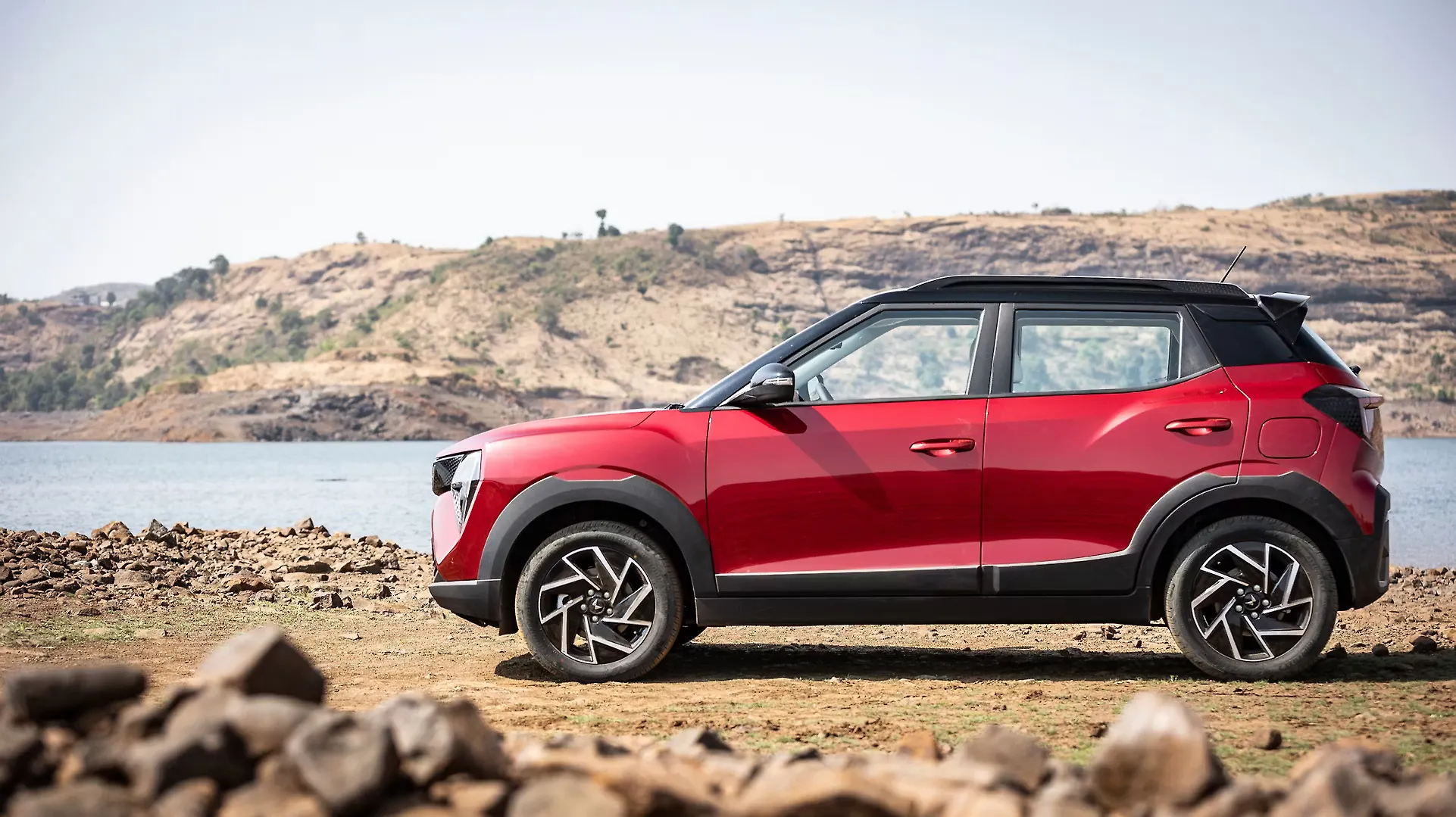 Red compact SUV parked outdoors. smooth edges, complex geometry, game-ready, symmetric geometry.