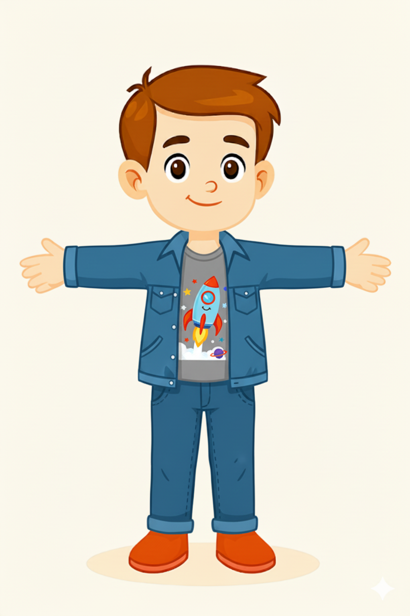 Cartoon boy standing with arms outstretched. smooth edges, simple geometry, game-ready, character, symmetric geometry.
