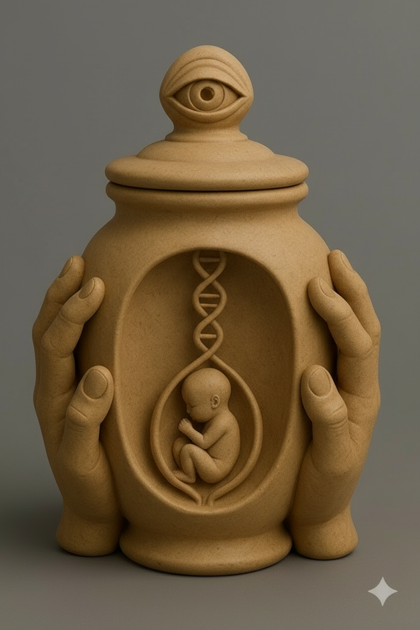 Decorative jar with hands as handles. smooth edges, complex geometry, symmetric geometry.