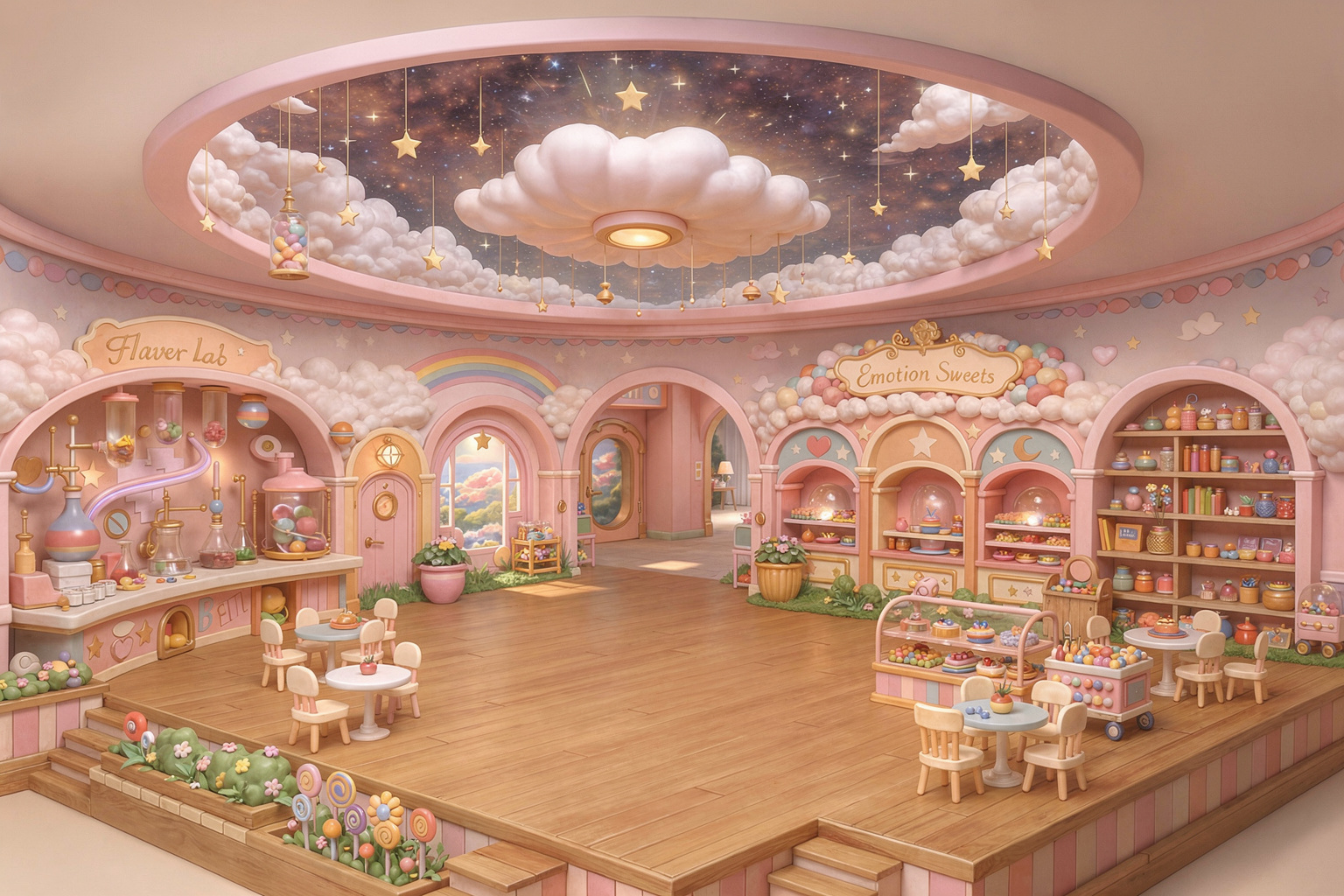 Whimsical pastel-themed dessert shop interior. complex geometry, sharp edges.