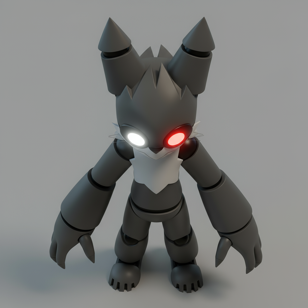 Robot-like creature with red eyes. smooth edges, simple geometry, game-ready, character, symmetric geometry.