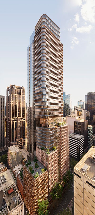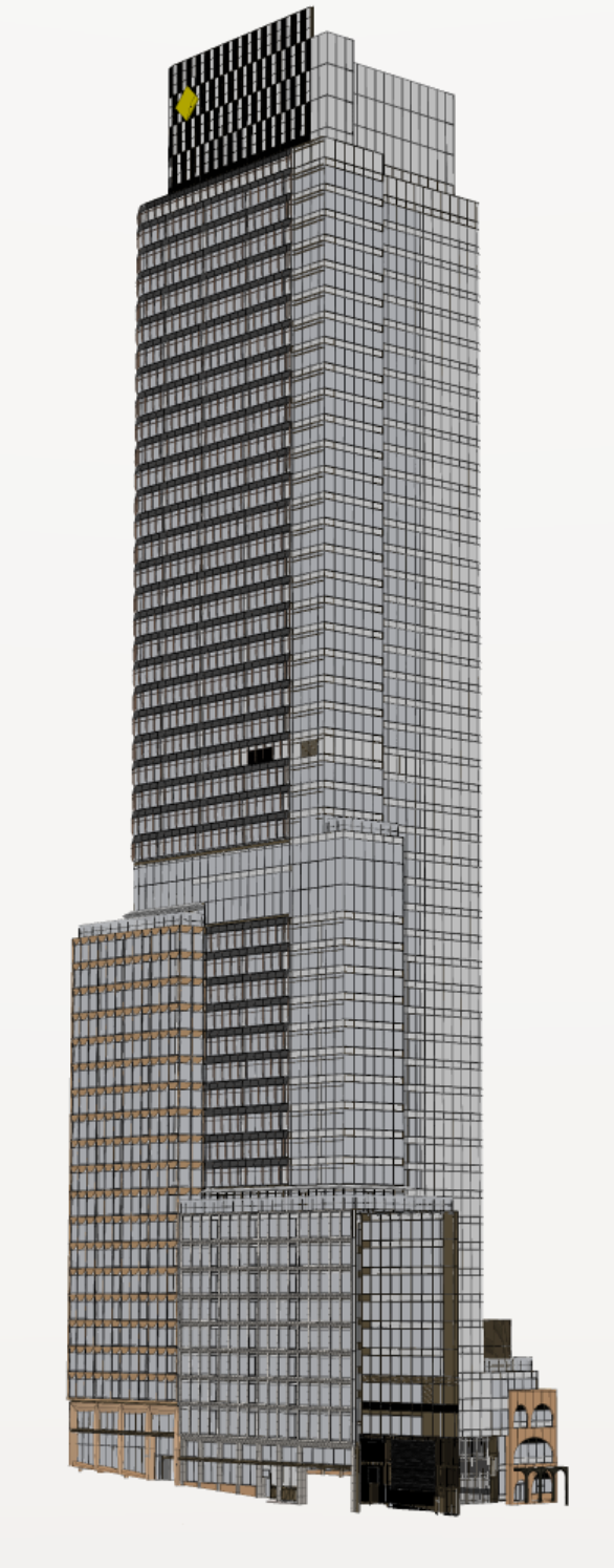 Tall modern skyscraper in city center. sharp edges, complex geometry, symmetric geometry.