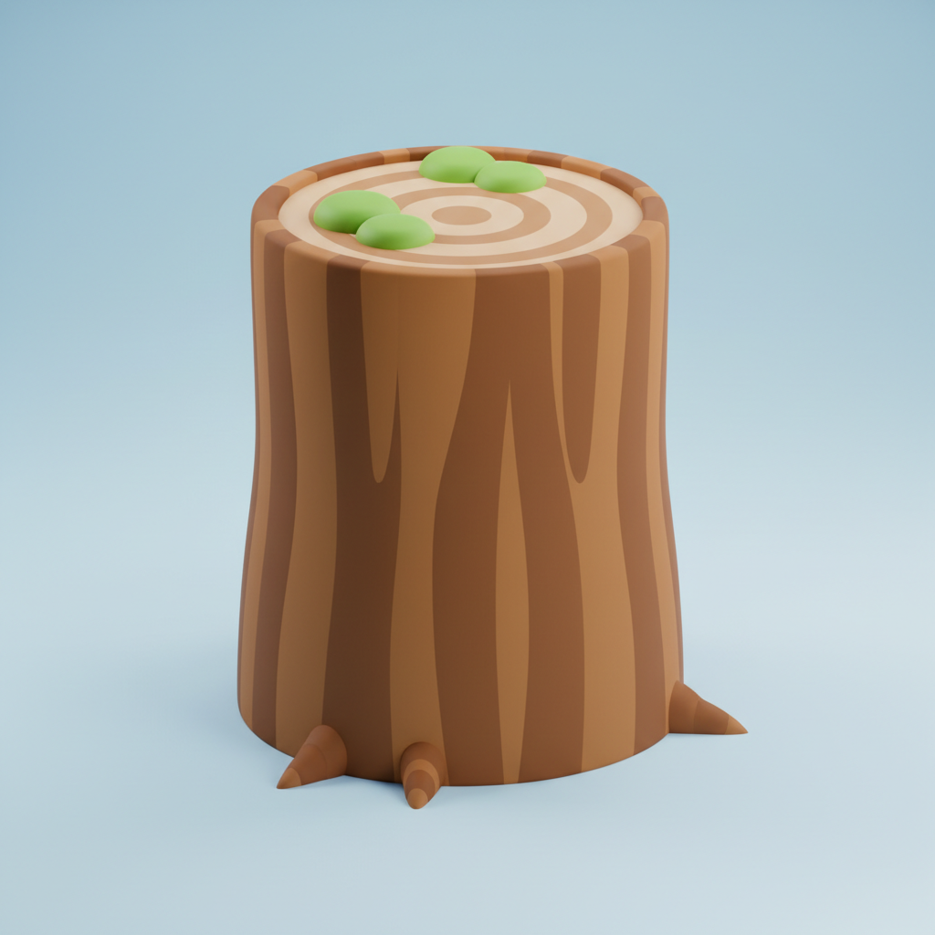 Cartoon tree stump with leaves. smooth edges, simple geometry, game-ready, symmetric geometry.
