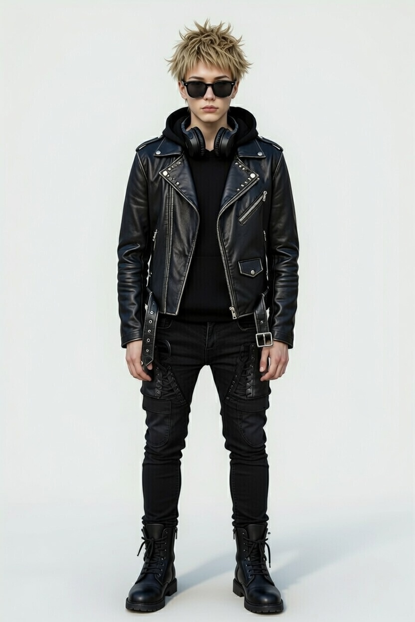 person in black leather clothing. complex geometry, character.