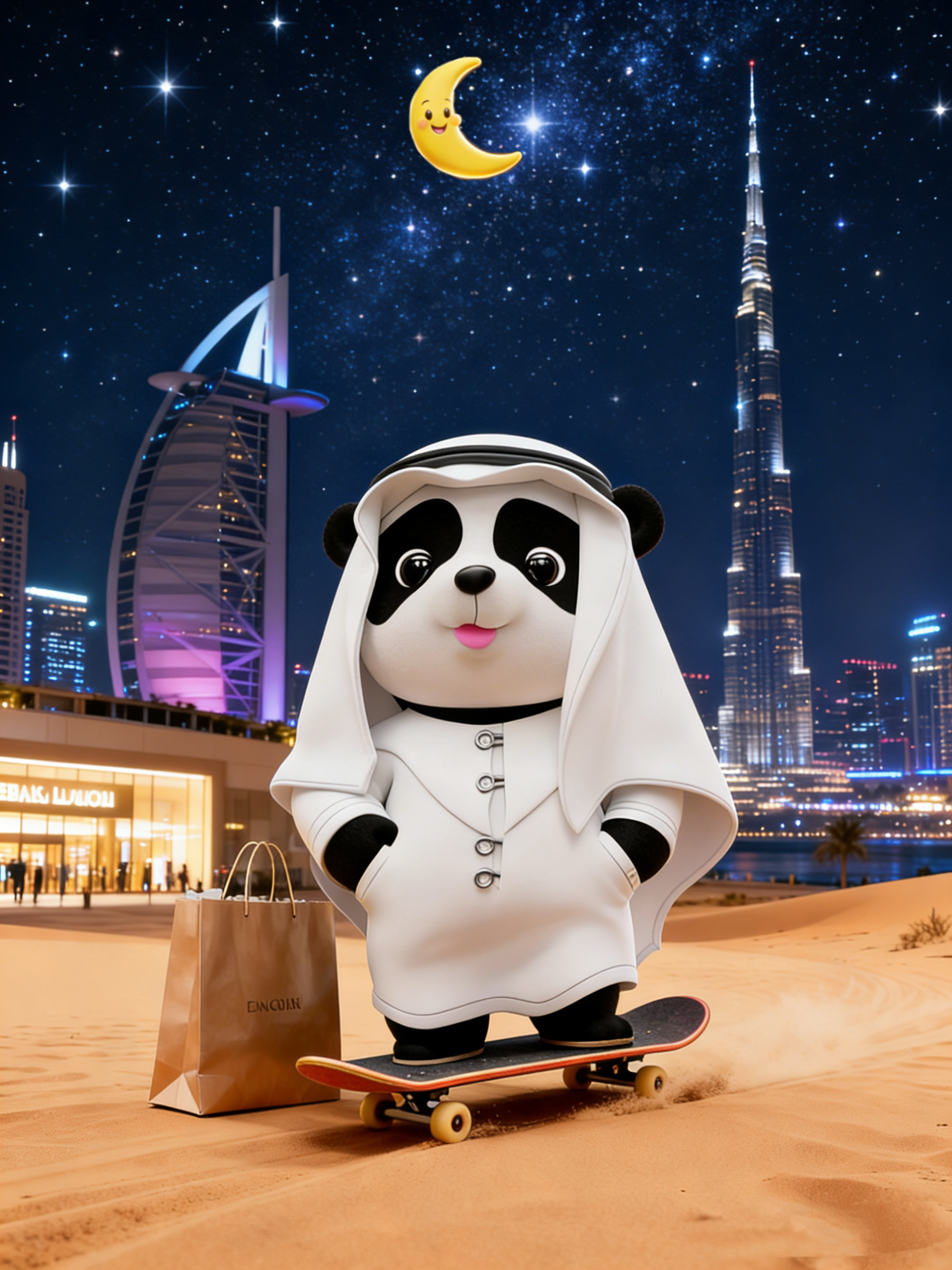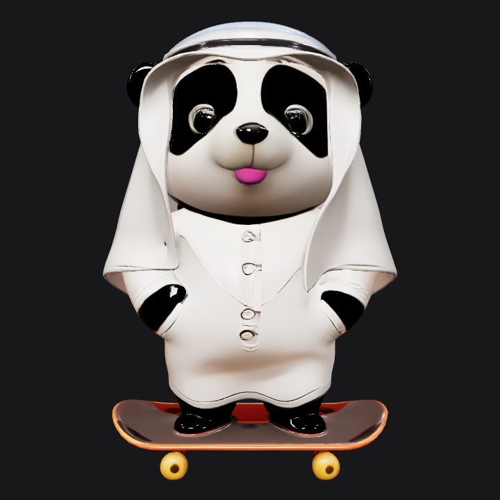 Panda character in white robe on skateboard. smooth edges, complex geometry, game-ready, character, symmetric geometry.
