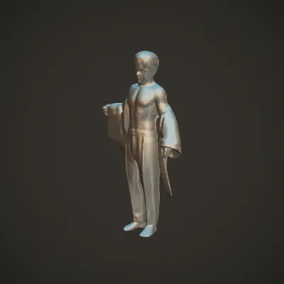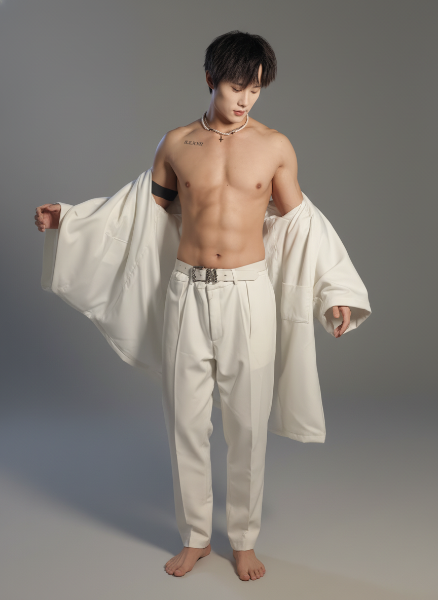 A shirtless man wearing white pants and robe. smooth edges, complex geometry, character.