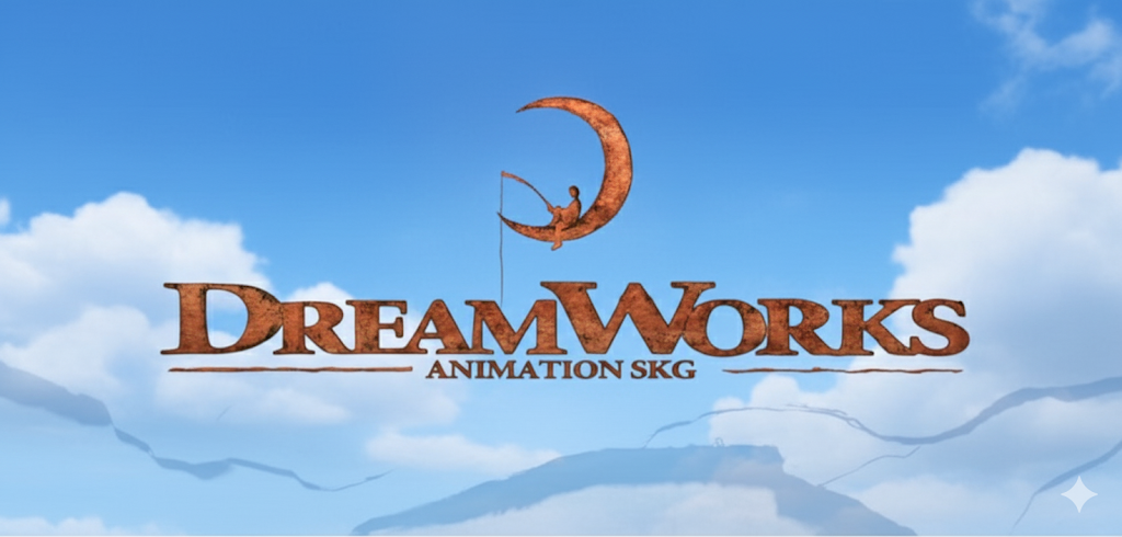 DreamWorks Animation logo with boy on moon. simple geometry, smooth edges, character.