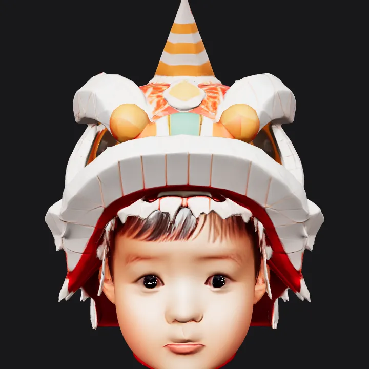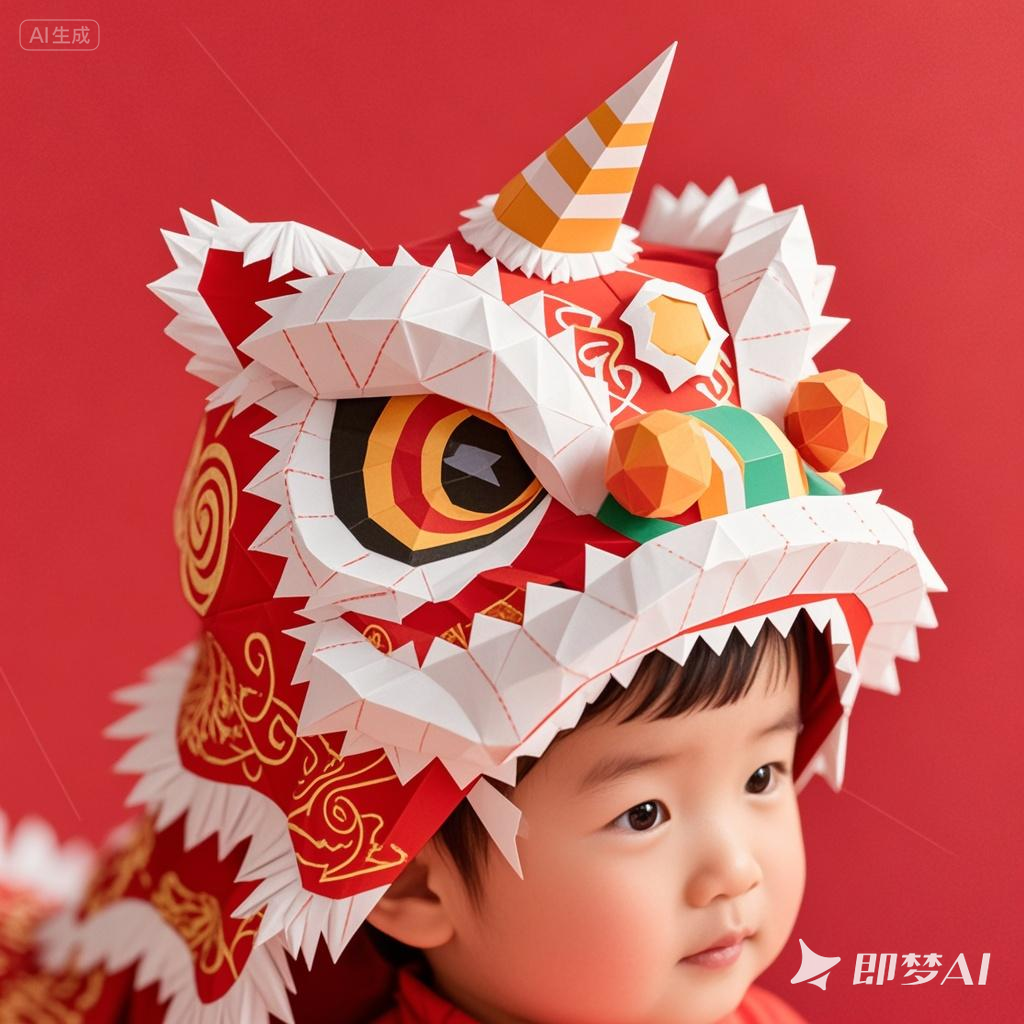 Person wearing a paper dragon head costume. sharp edges, complex geometry, character.