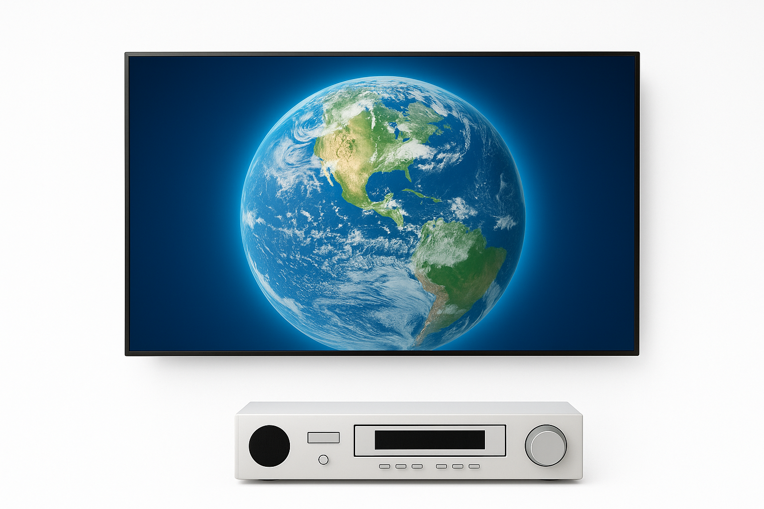 A TV showing Earth and an audio receiver. sharp edges, simple geometry, symmetric geometry.