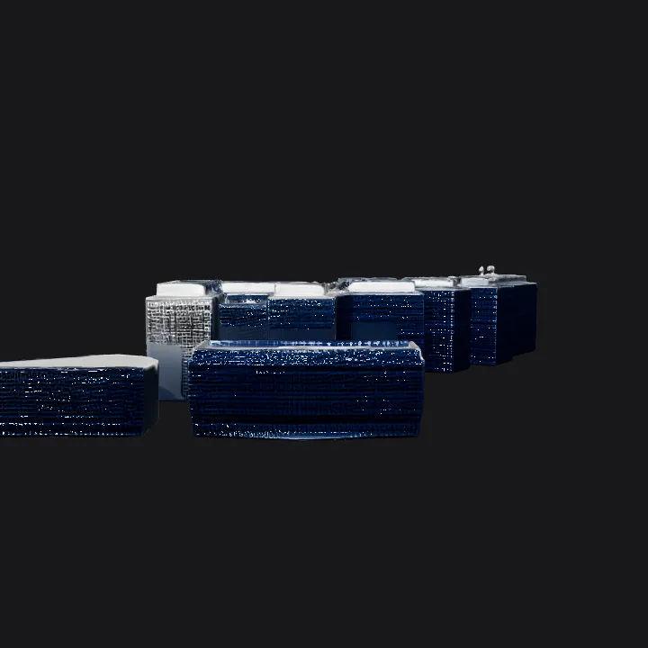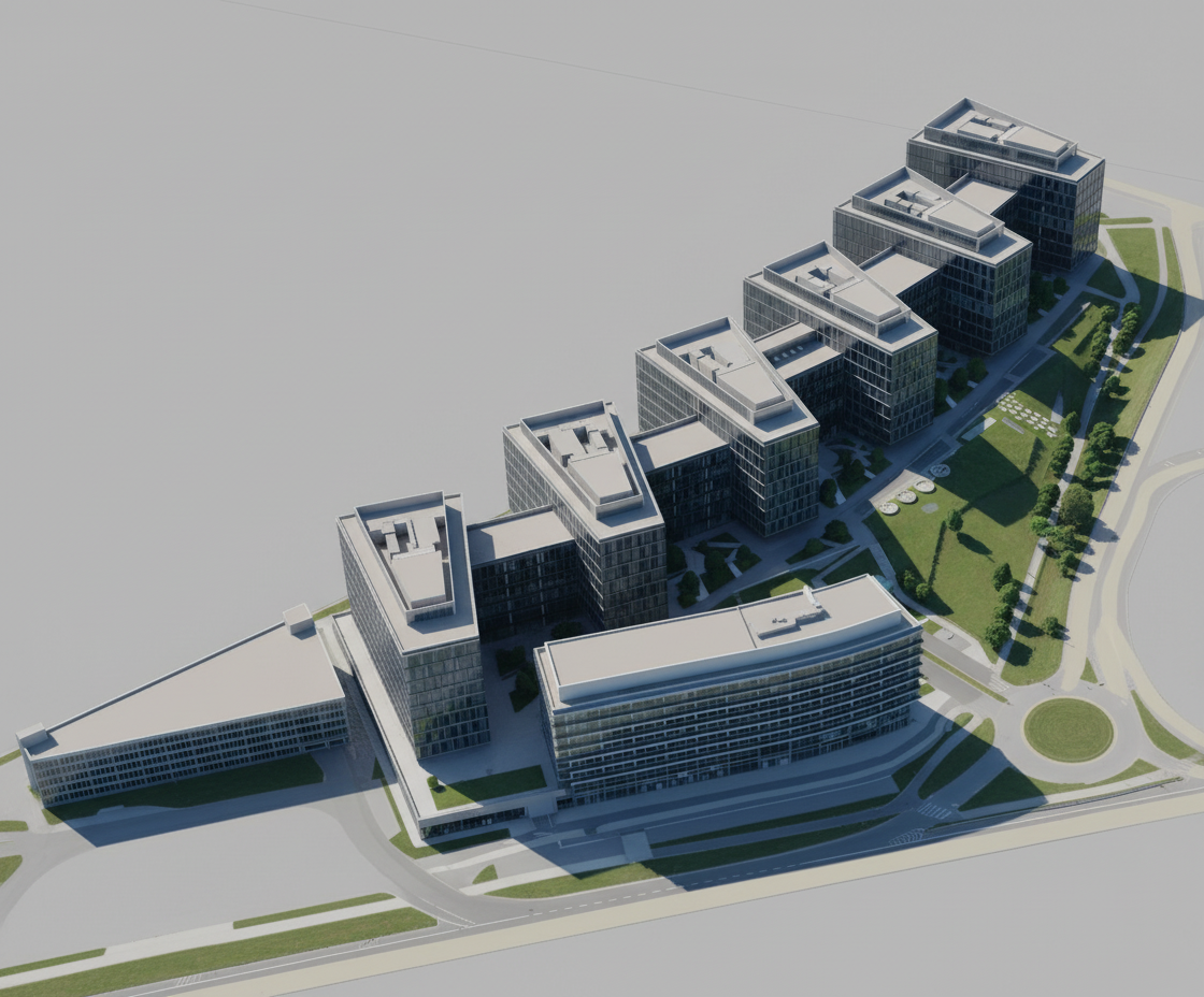 Modern office building complex. sharp edges, complex geometry, game-ready.