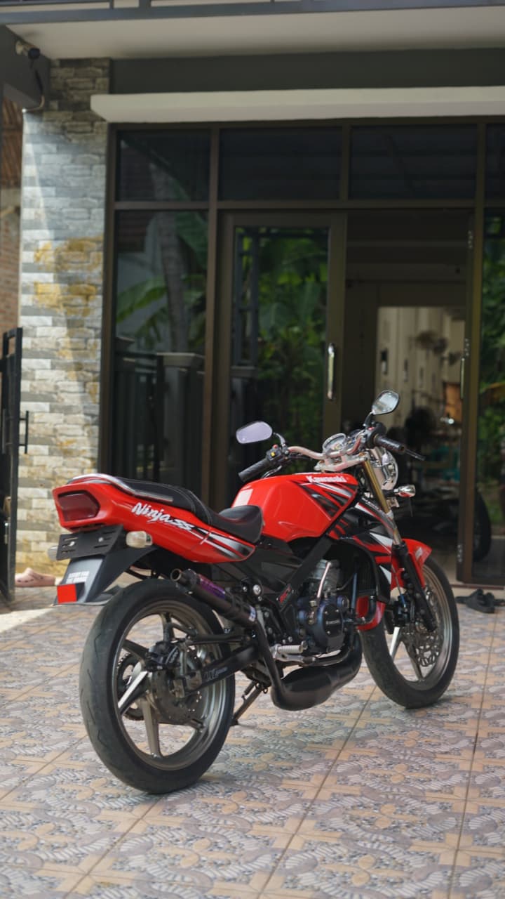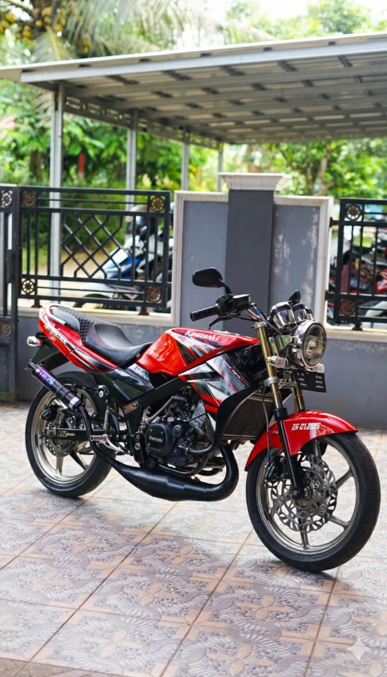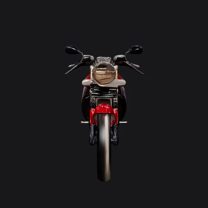 Red and black motorcycle parked outdoors. sharp edges, complex geometry, symmetric geometry.