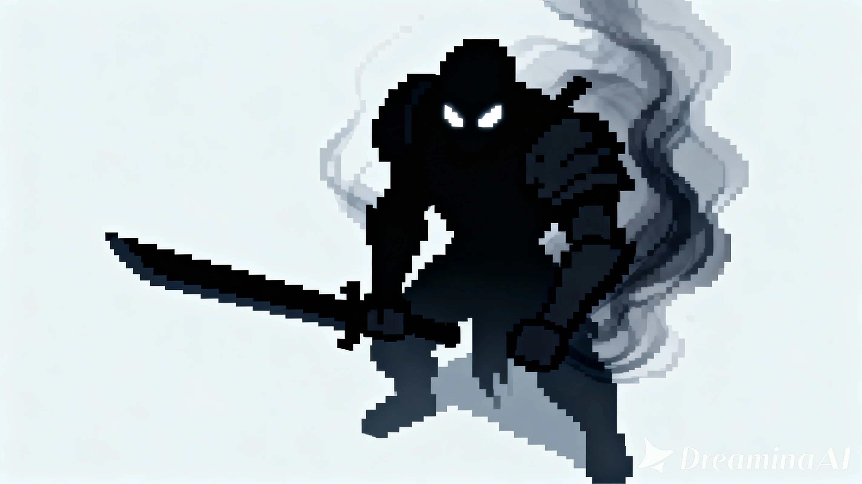 Pixelated shadowy armored warrior with sword. sharp edges, simple geometry, game-ready, character.