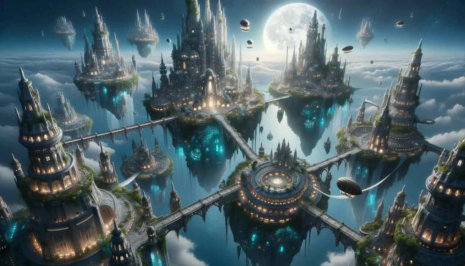 Futuristic floating city with towers. complex geometry, sharp edges, game-ready.