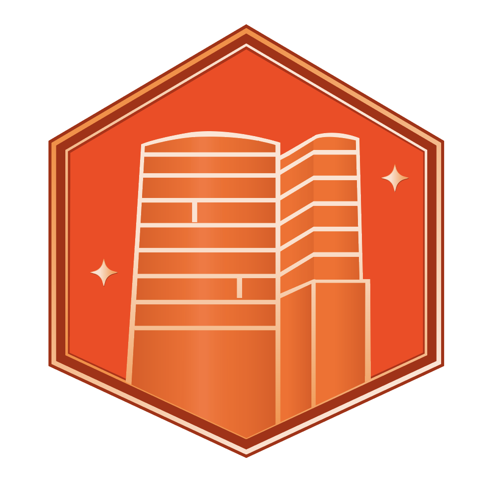 Modern building in hexagonal logo style. sharp edges, simple geometry, game-ready.
