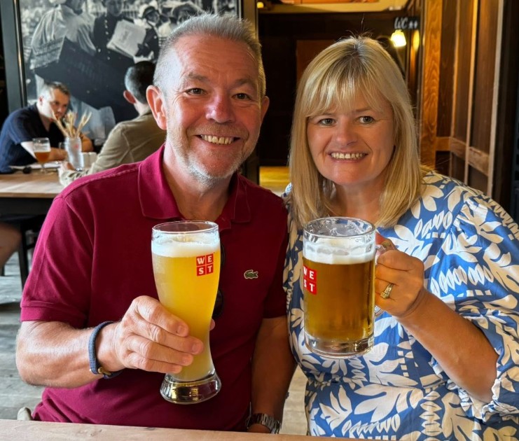 Two adults holding beer glasses in a pub. complex geometry, smooth edges, character.
