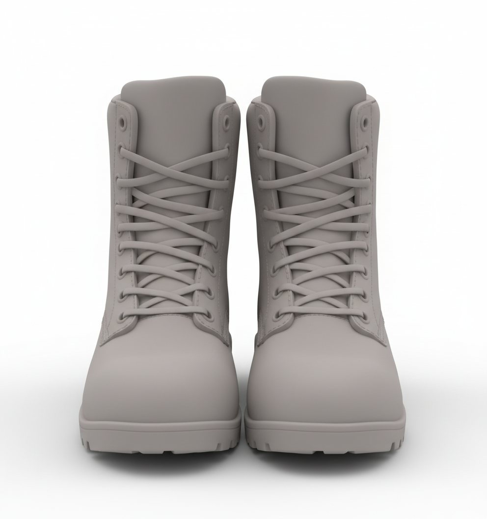A pair of military-style boots. smooth edges, complex geometry, symmetric geometry.