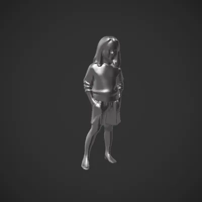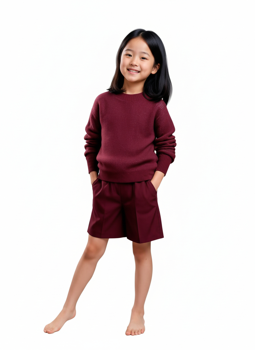 Standing child in burgundy outfit. smooth edges, complex geometry, character.
