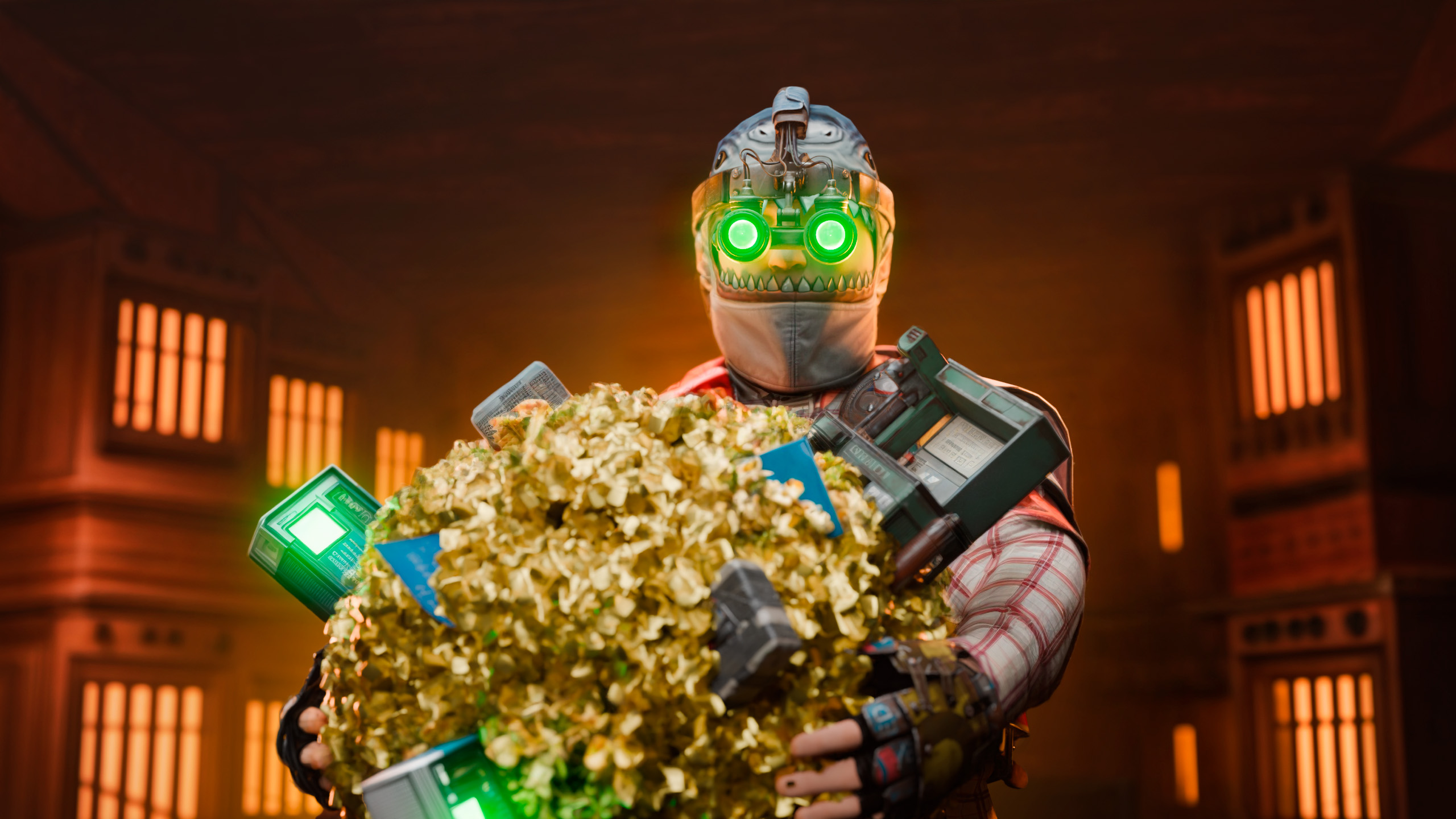 Robot holding glowing objects and popcorn. sharp edges, complex geometry, game-ready, character.