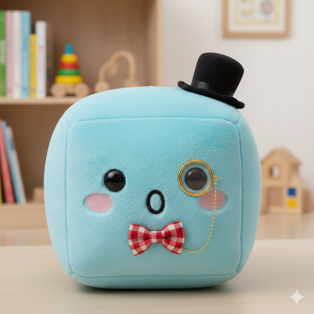 Blue plush toy with top hat and monocle. simple geometry, character.