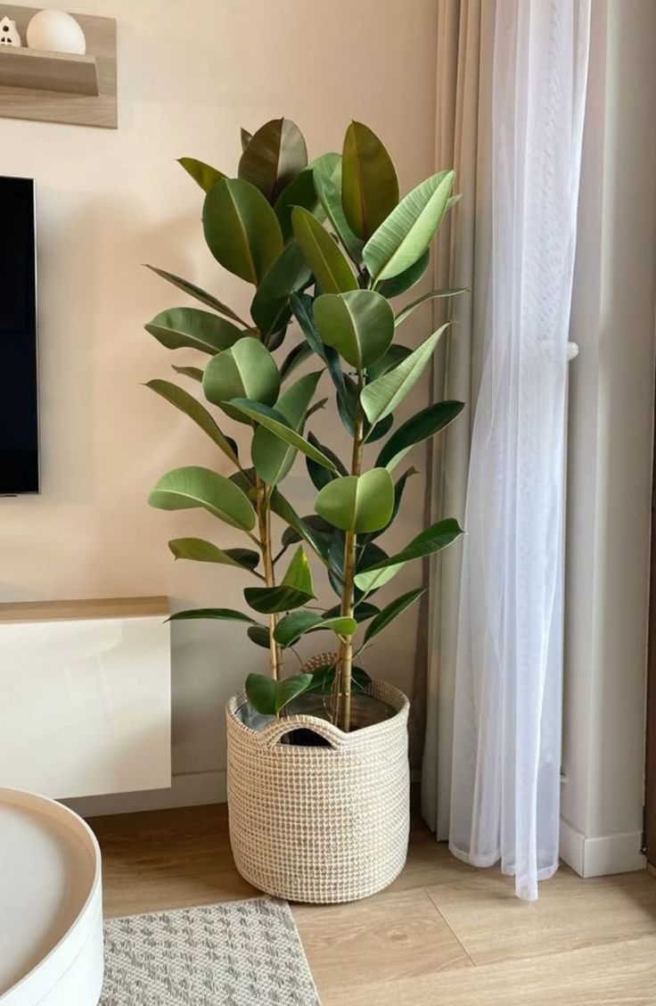Rubber plant in a woven basket pot. complex geometry.