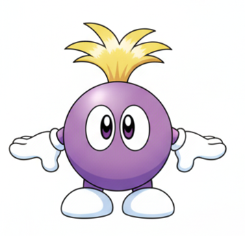 Cartoon purple creature with gloves and shoes. smooth edges, simple geometry, game-ready, character.