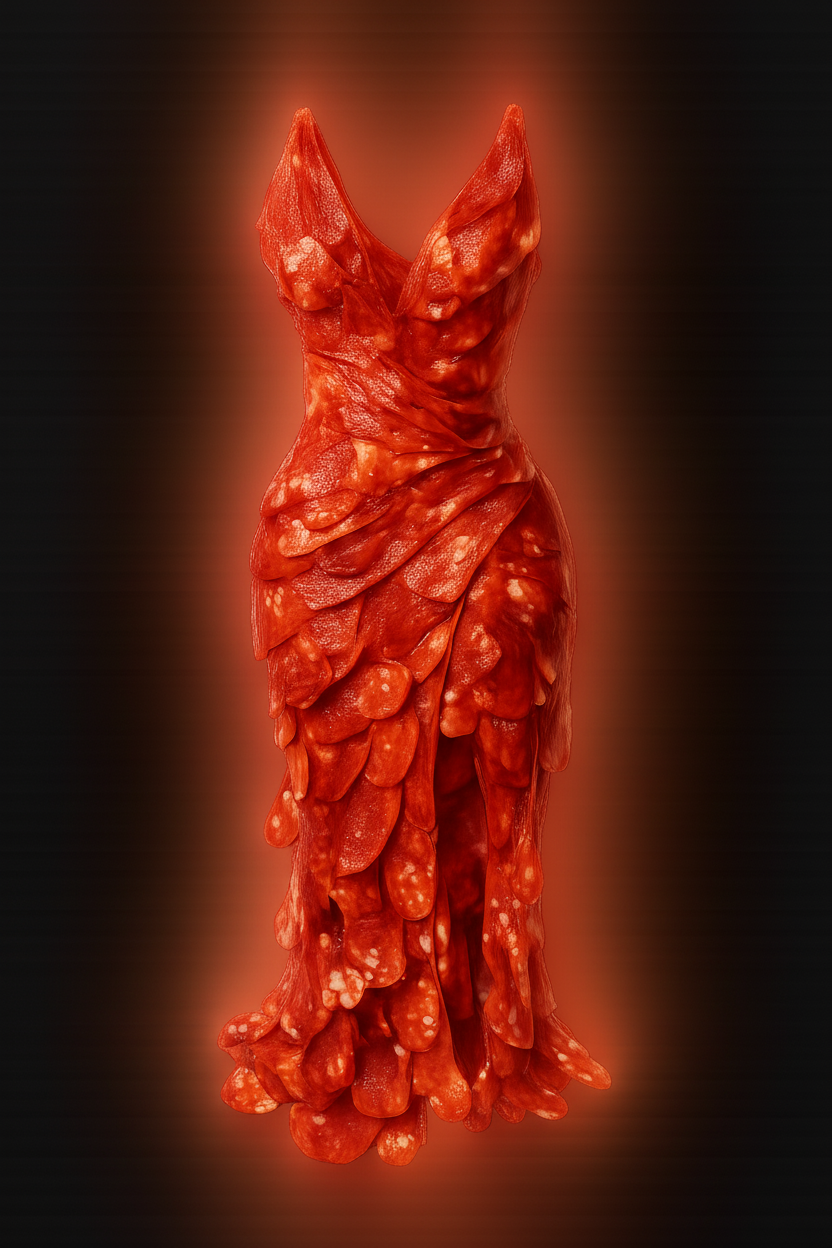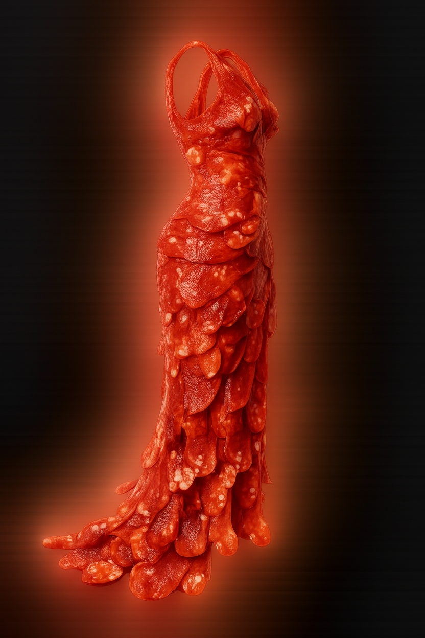 Dress made of pepperoni slices. complex geometry.