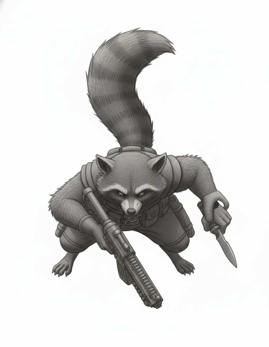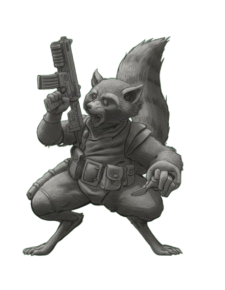 Raccoon warrior holding a gun. complex geometry, sharp edges, game-ready, character.