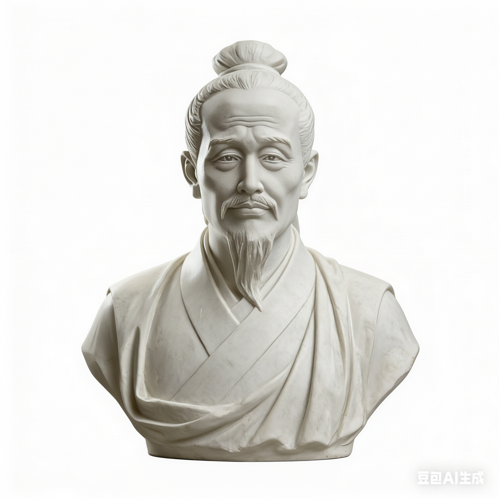 Marble bust of a robed figure with a topknot. smooth edges, complex geometry, character, symmetric geometry.