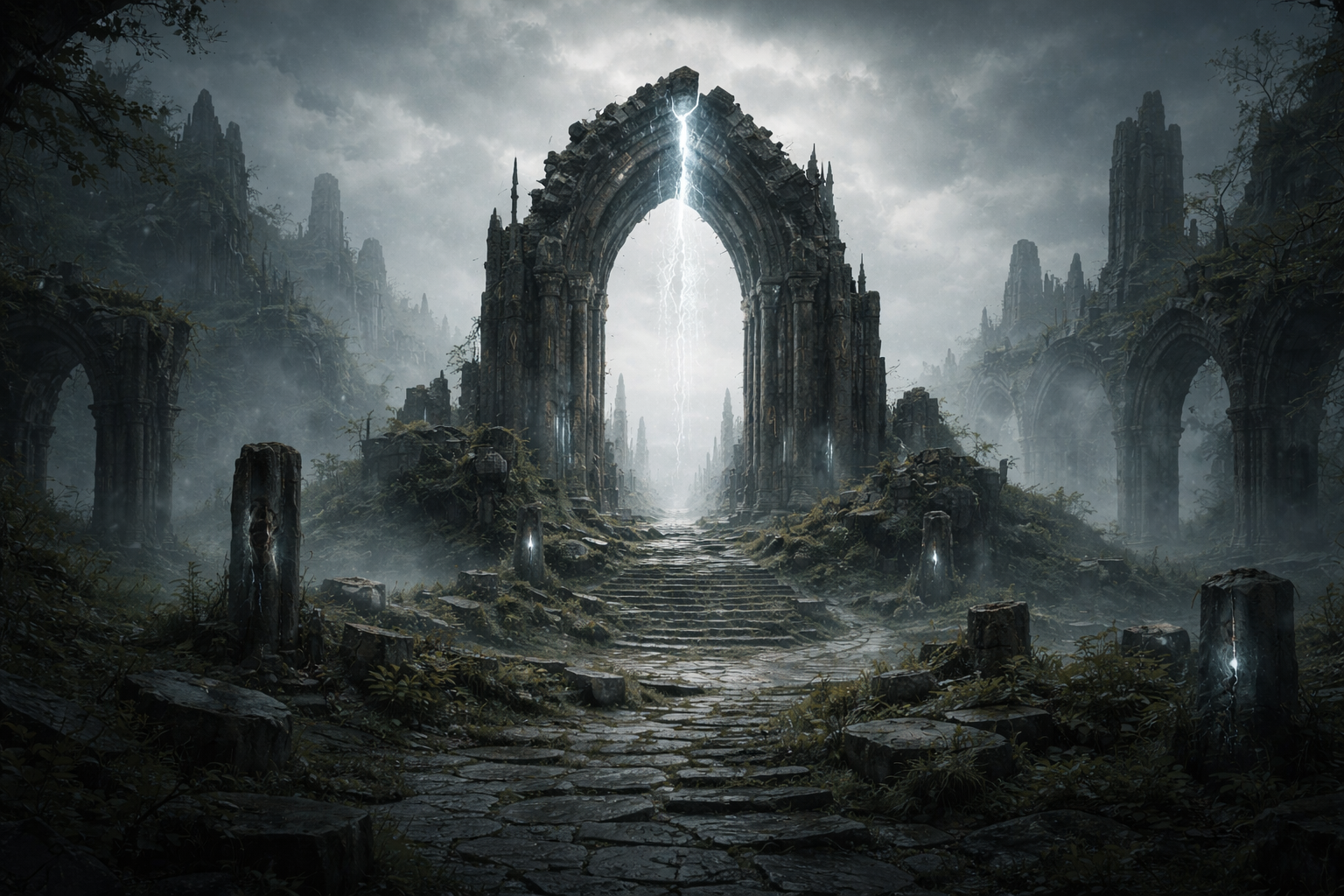 Ancient stone archway in misty ruins. sharp edges, complex geometry, game-ready, symmetric geometry.
