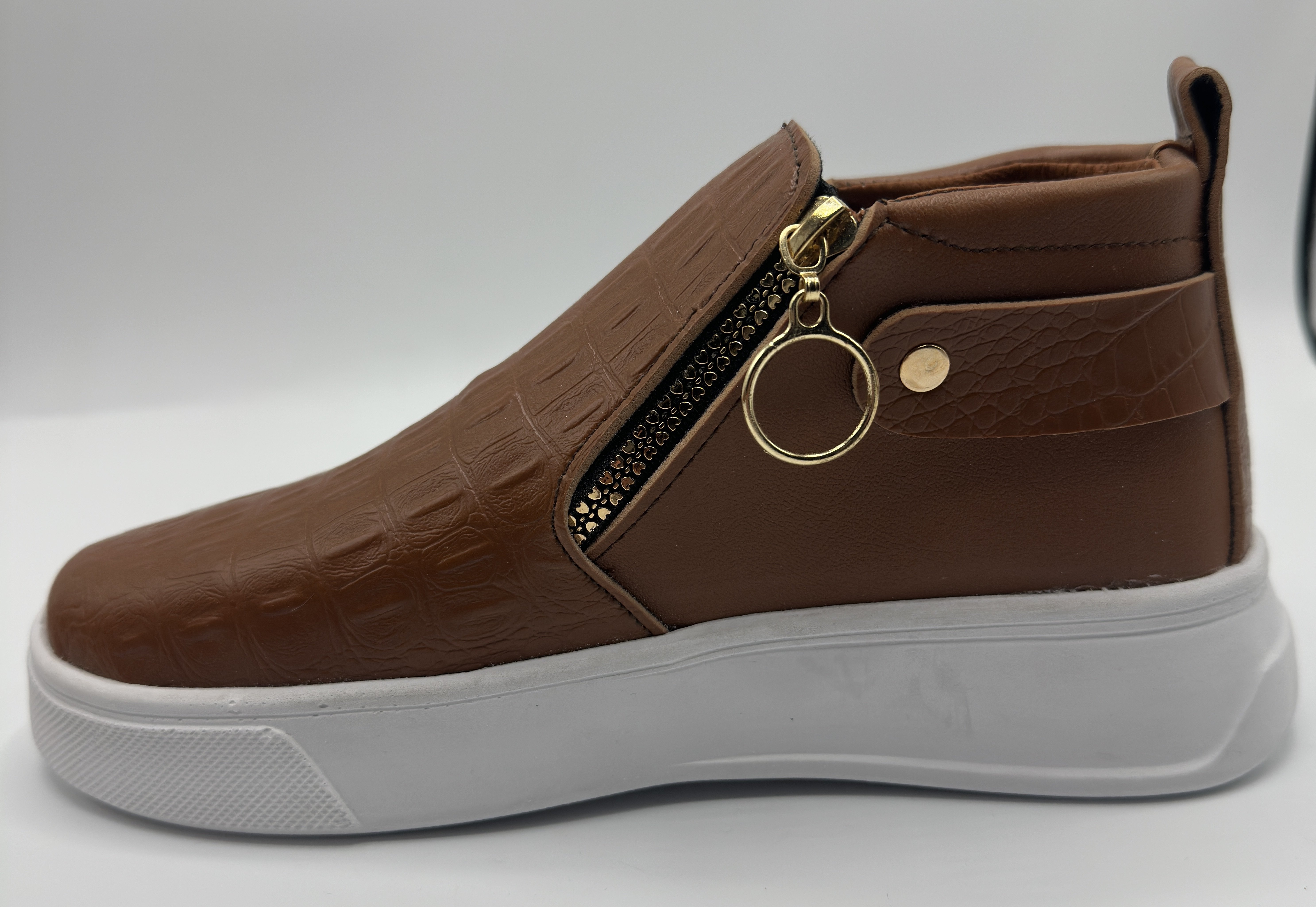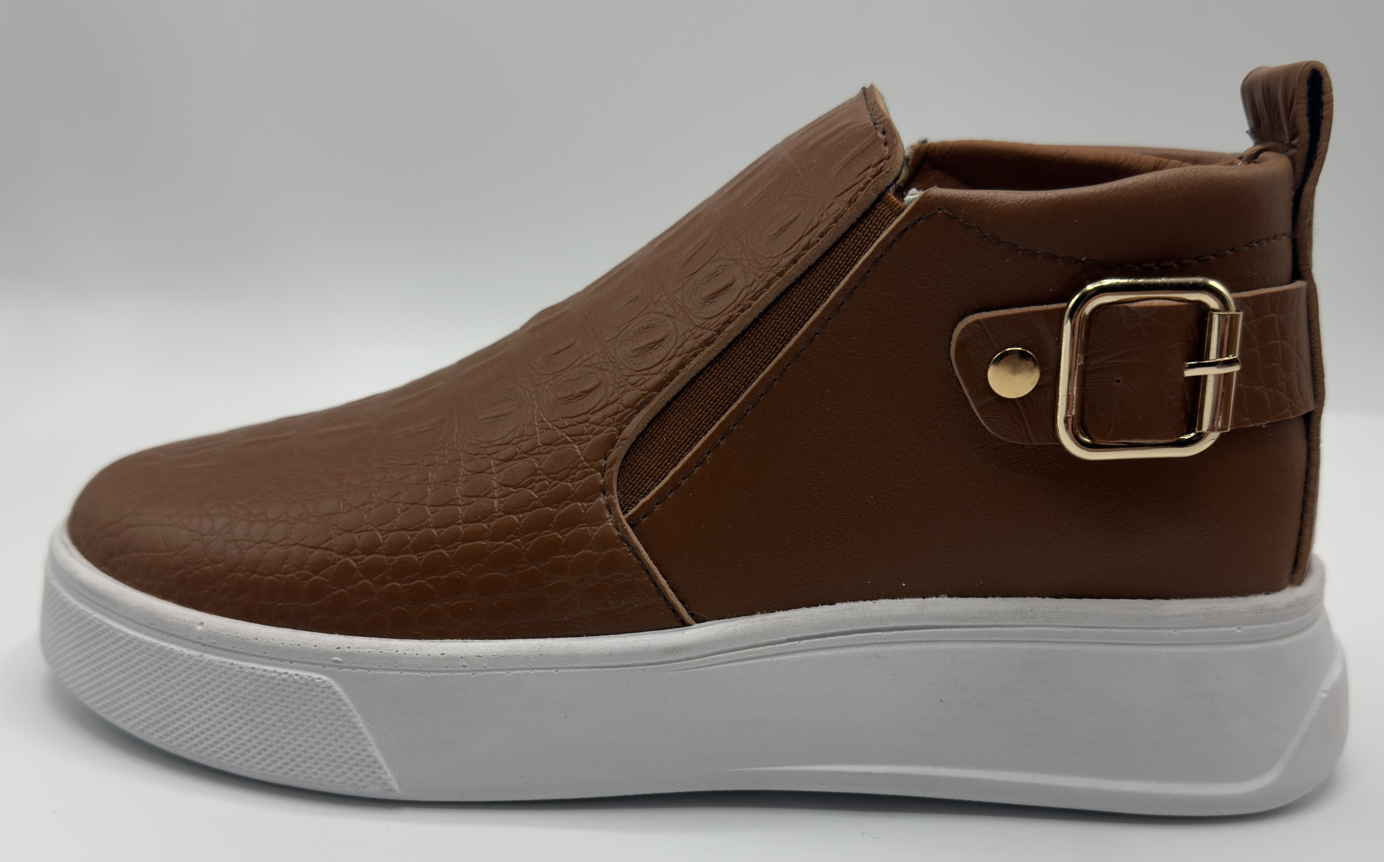 brown sneaker shoe with white sole. smooth edges, simple geometry, game-ready, symmetric geometry.
