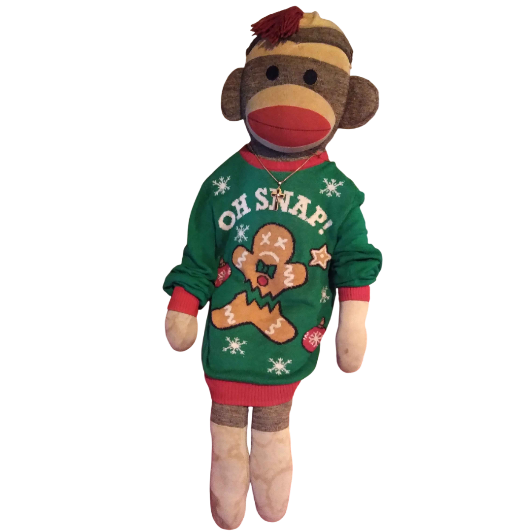 A sock monkey doll wearing Christmas sweater. smooth edges, simple geometry, character, symmetric geometry.