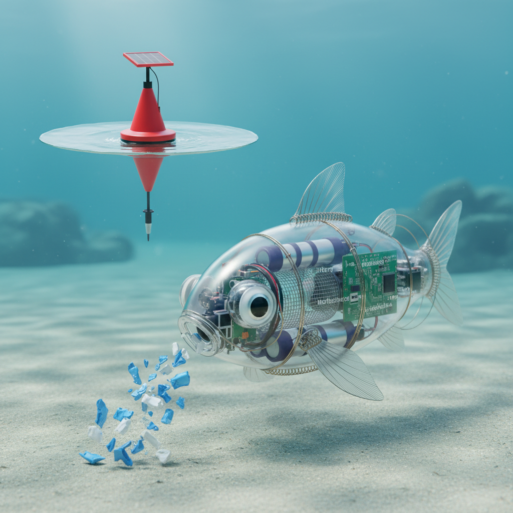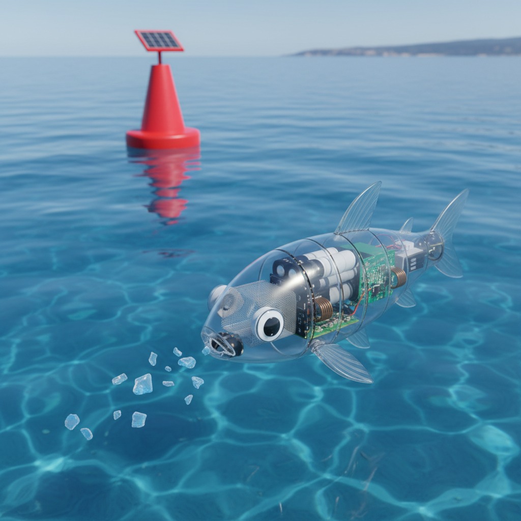 Robotic fish swimming in the ocean. smooth edges, complex geometry, game-ready, symmetric geometry.