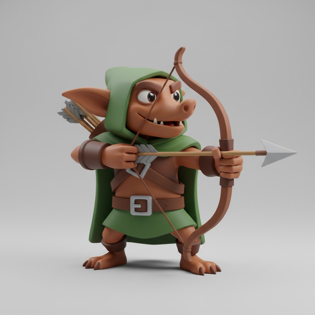 Goblin archer holding bow and arrows. smooth edges, simple geometry, game-ready, character.