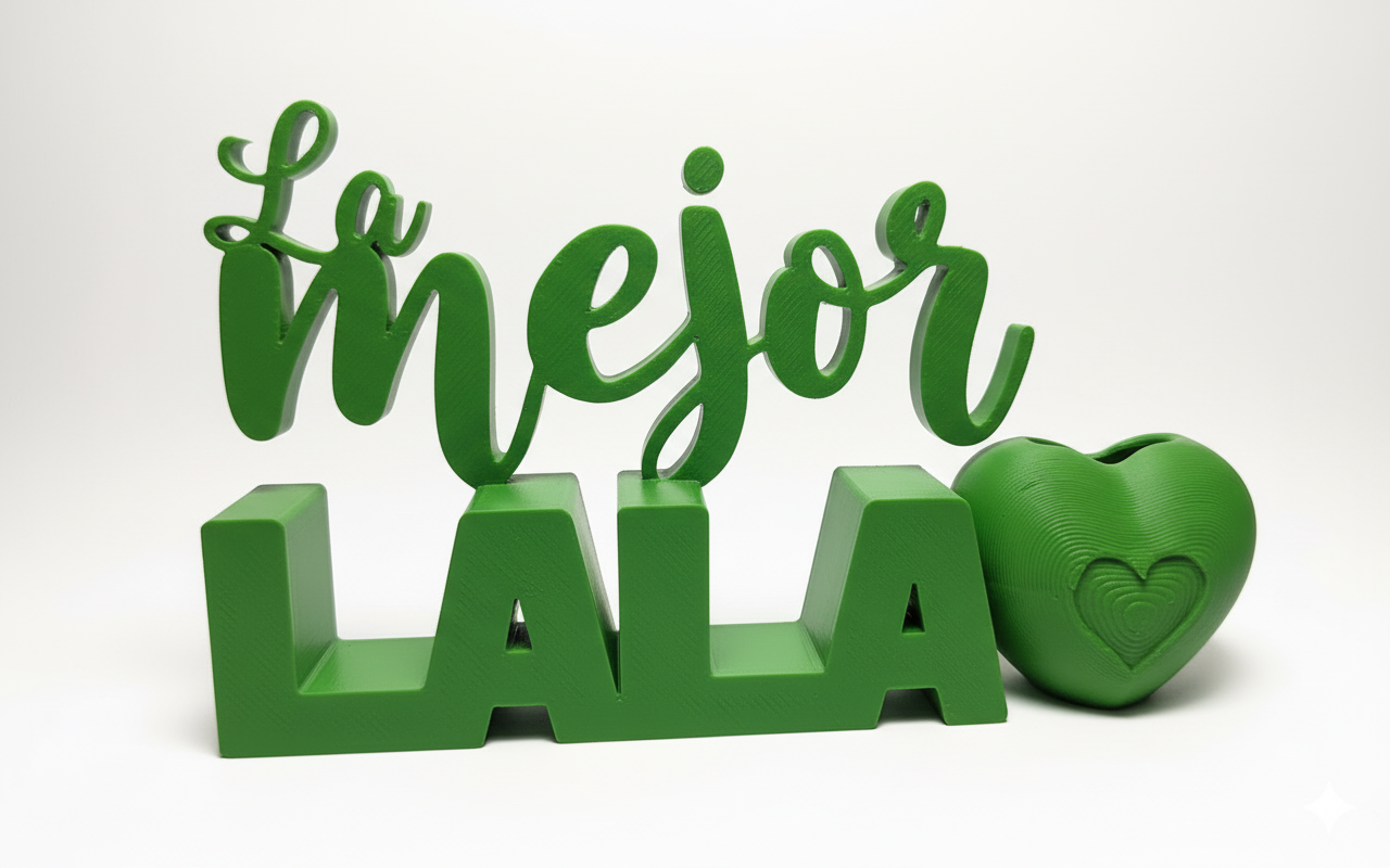 Green decorative letters and heart sculpture. sharp edges, simple geometry.