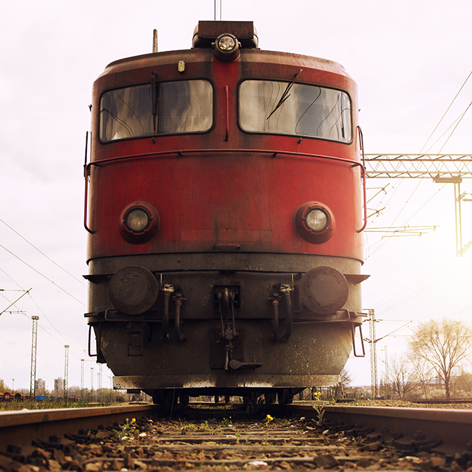 Front view of a red train locomotive. smooth edges, complex geometry, symmetric geometry.