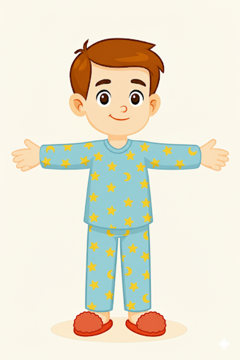 Cartoon boy in star-patterned pajamas. smooth edges, simple geometry, character, symmetric geometry.