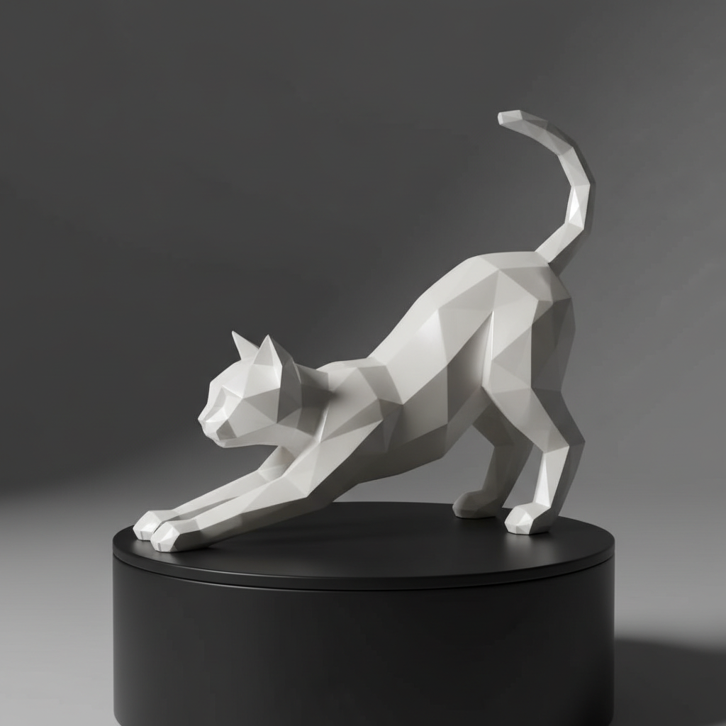 Low-poly cat stretching sculpture. sharp edges, complex geometry, game-ready, character.