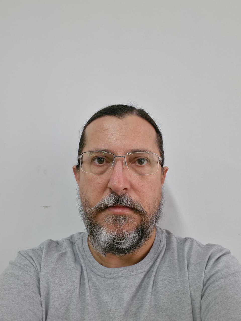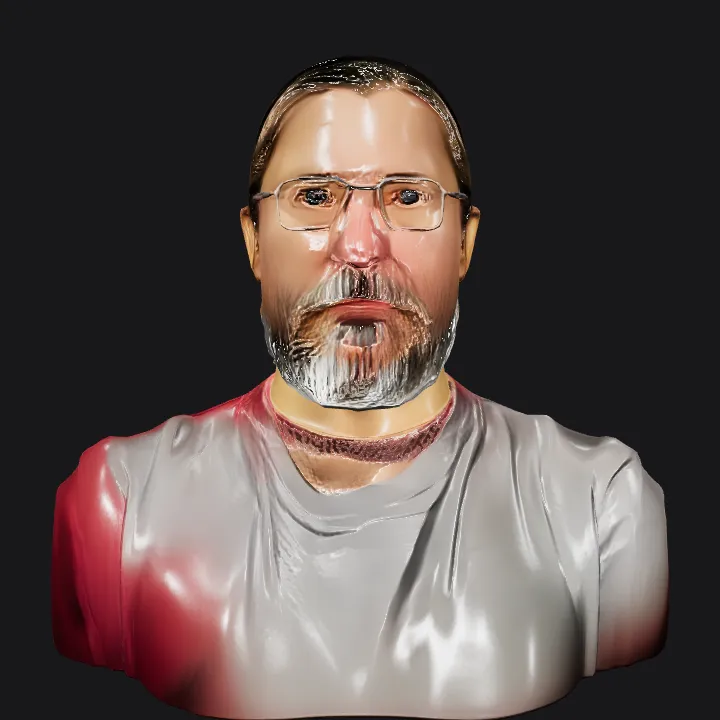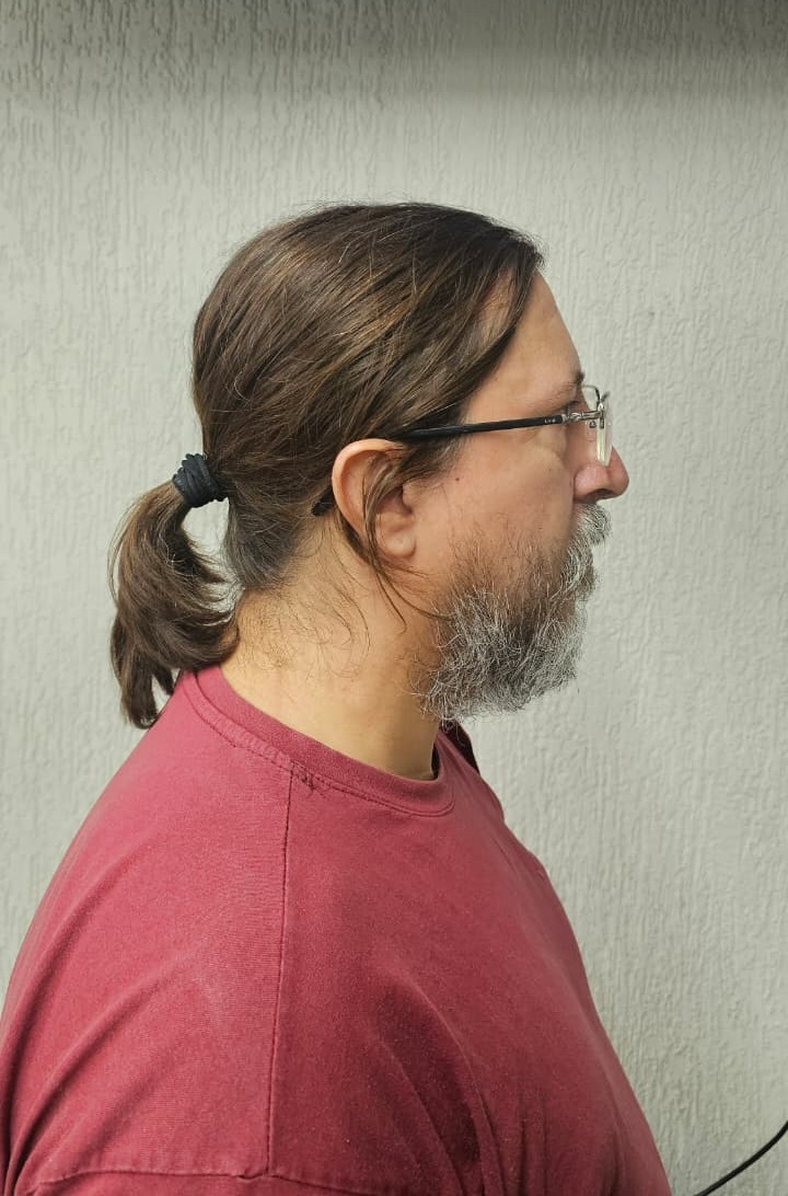 Man with ponytail wearing red t-shirt. smooth edges, complex geometry, character.