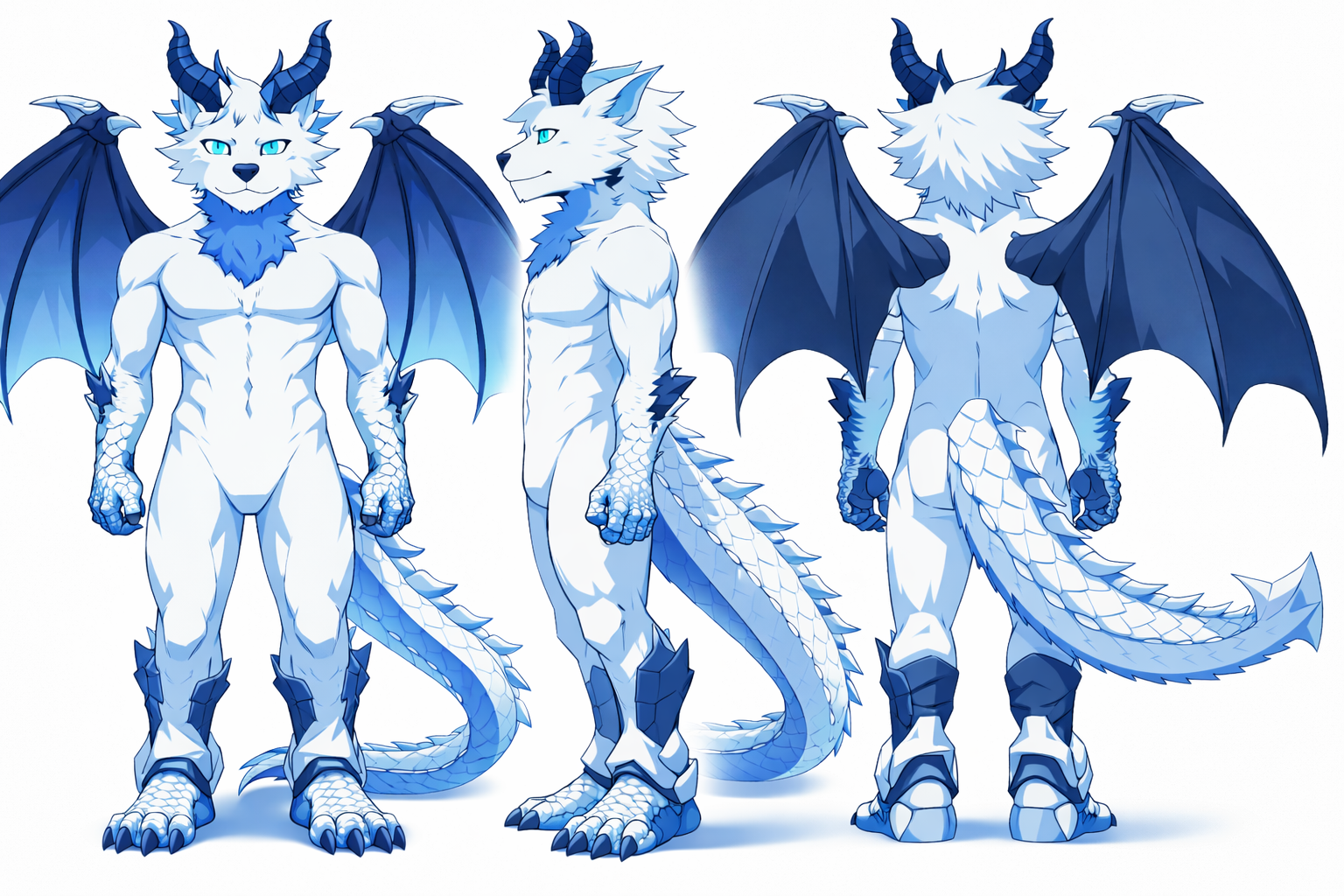 Anthropomorphic dragon character with blue and white colors. complex geometry, game-ready, character, symmetric geometry.