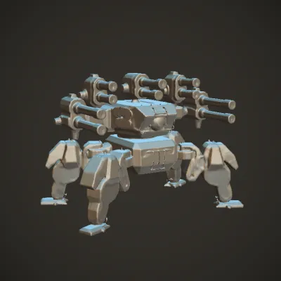 Four-legged futuristic robotic tank with multiple cannons. sharp edges, complex geometry, game-ready, symmetric geometry.