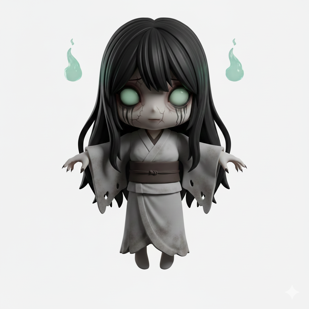 Chibi-style ghost girl with glowing eyes. smooth edges, simple geometry, game-ready, character, symmetric geometry.