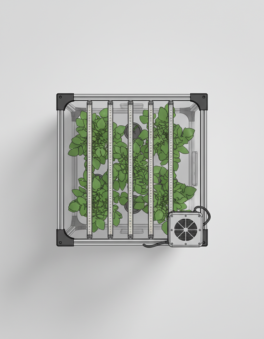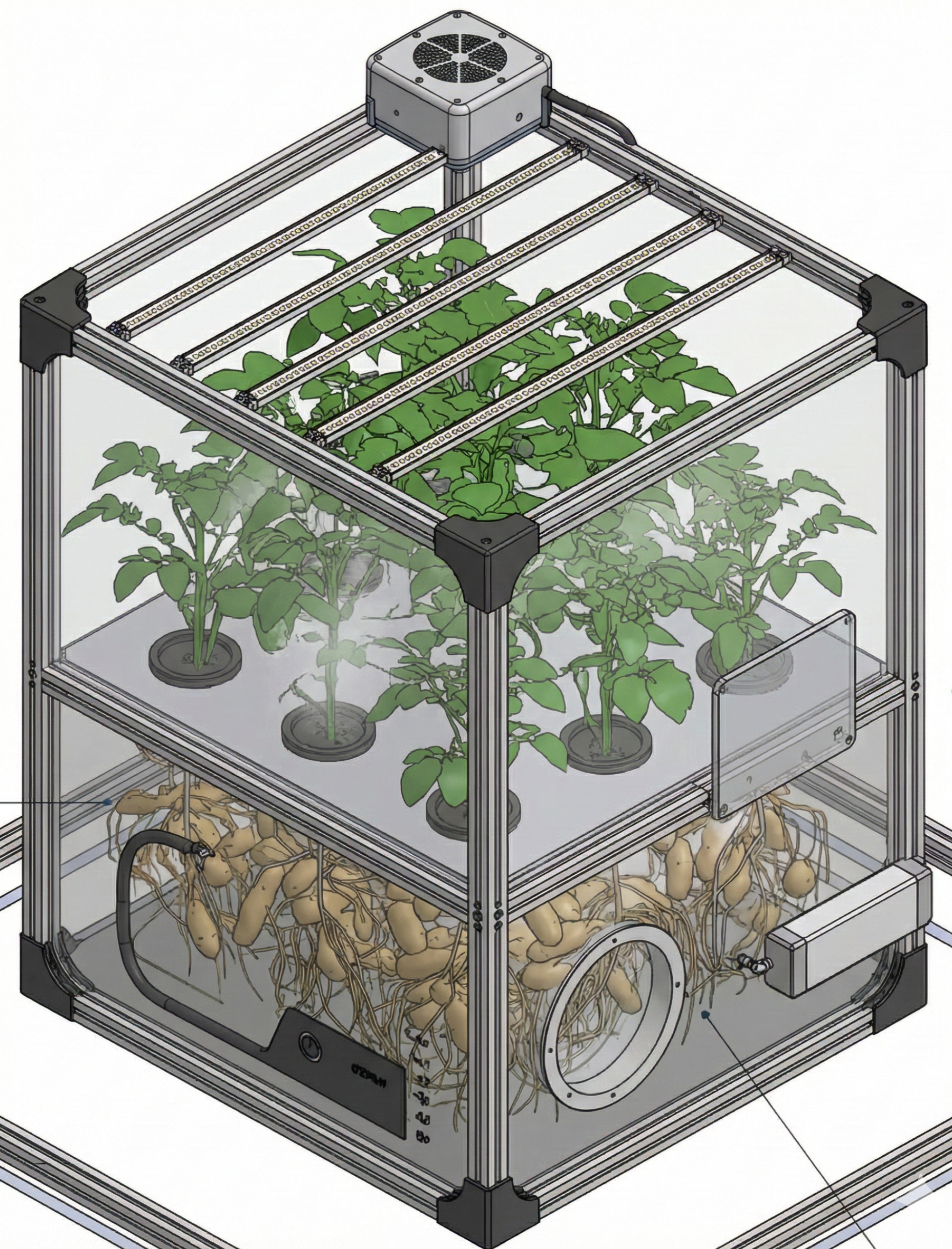 Hydroponic plant growing system with visible roots. sharp edges, complex geometry, symmetric geometry.