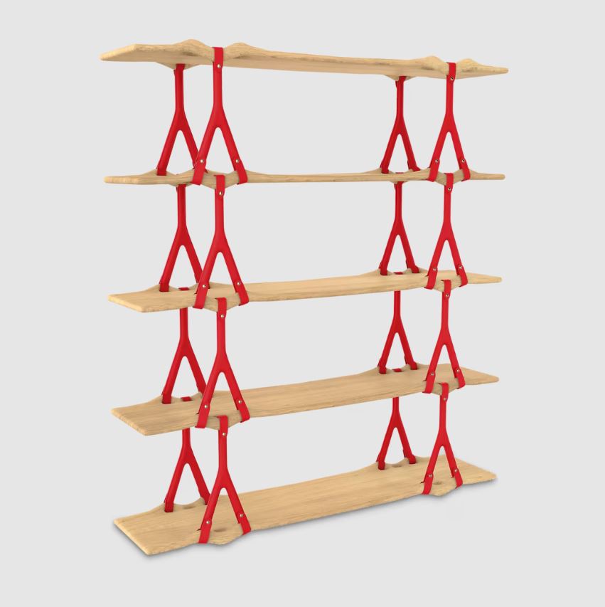 Wooden shelf with red supports. simple geometry, sharp edges, game-ready, symmetric geometry.