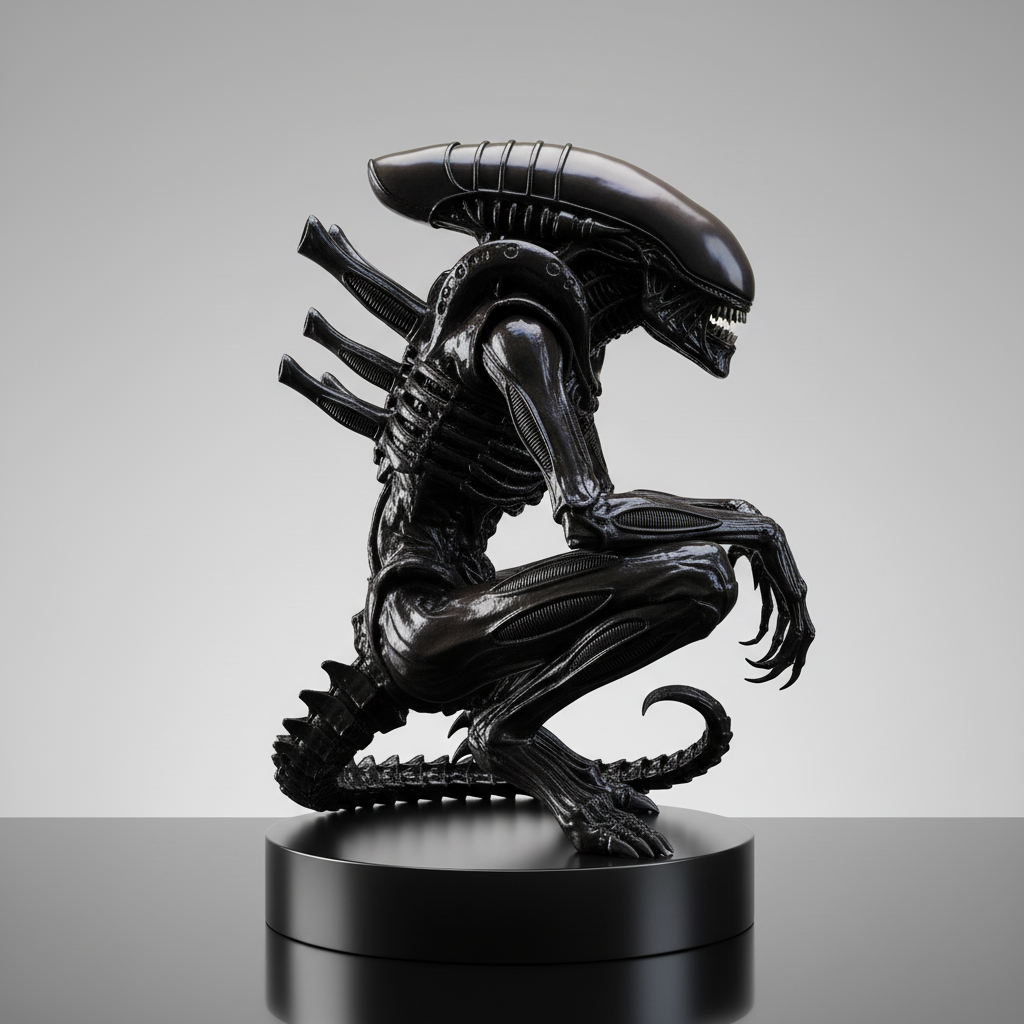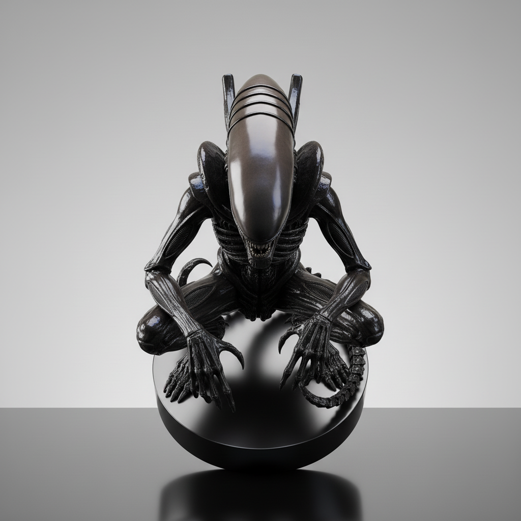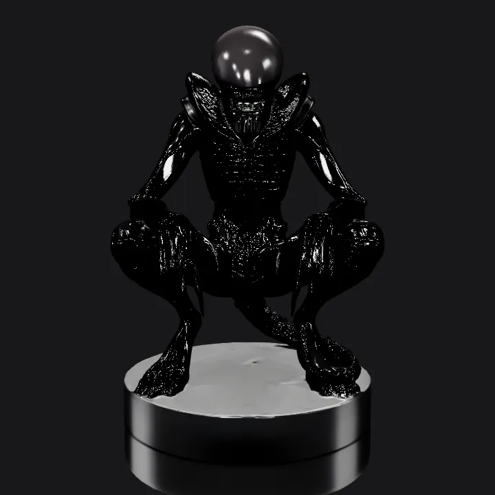 Alien creature crouching on a base. sharp edges, complex geometry, game-ready, character.