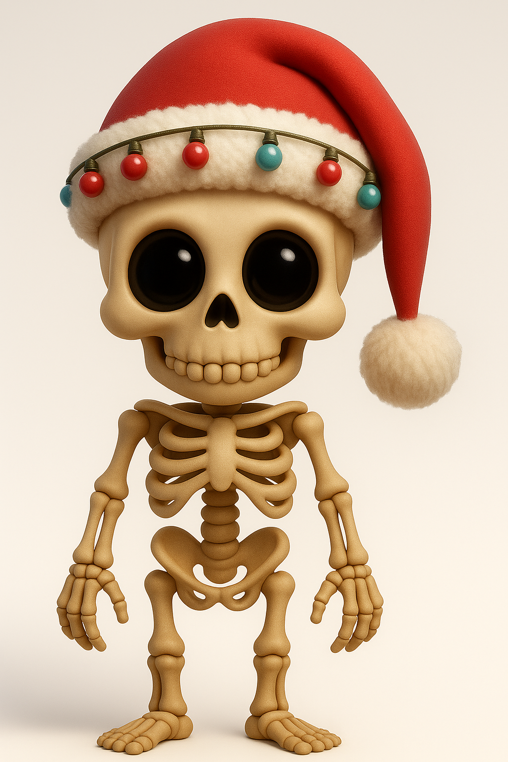 cartoon skeleton in Santa hat. smooth edges, simple geometry, game-ready, character, symmetric geometry.